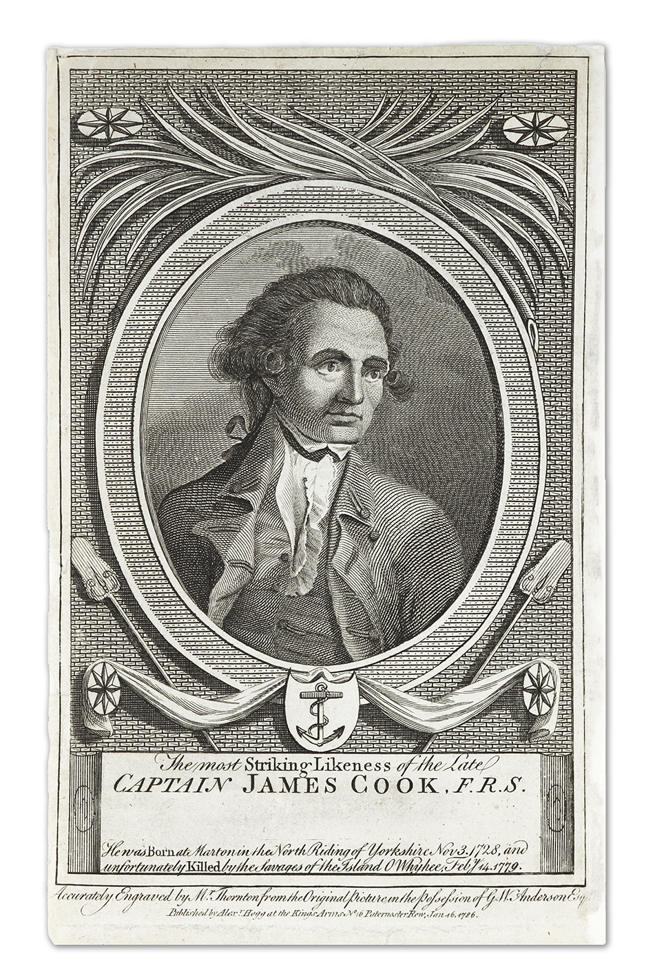 C18th engraved portrait based on the portrait made by William Hodges of Cook after his return from his second voyage and having been promoted to Captain. Below the title it states ‘ Killed…Feb 14. 1779’