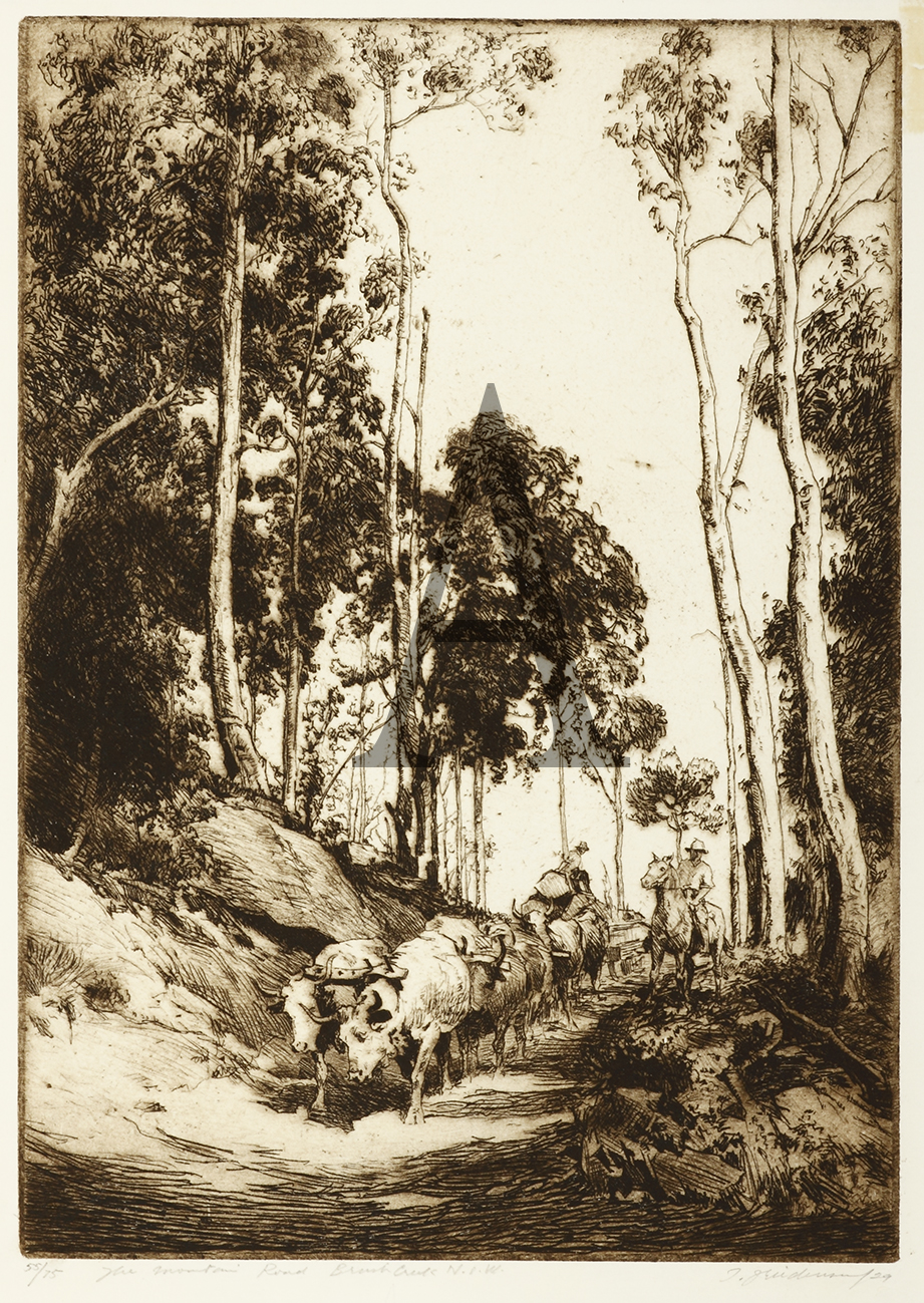 Fine etching of a bullock wagon carrying logs, descending Brush Creek Road, in Yarramalong valley by Thomas Friedensen Collections: National Gallery of Australia: LEGACY ID 1000008928