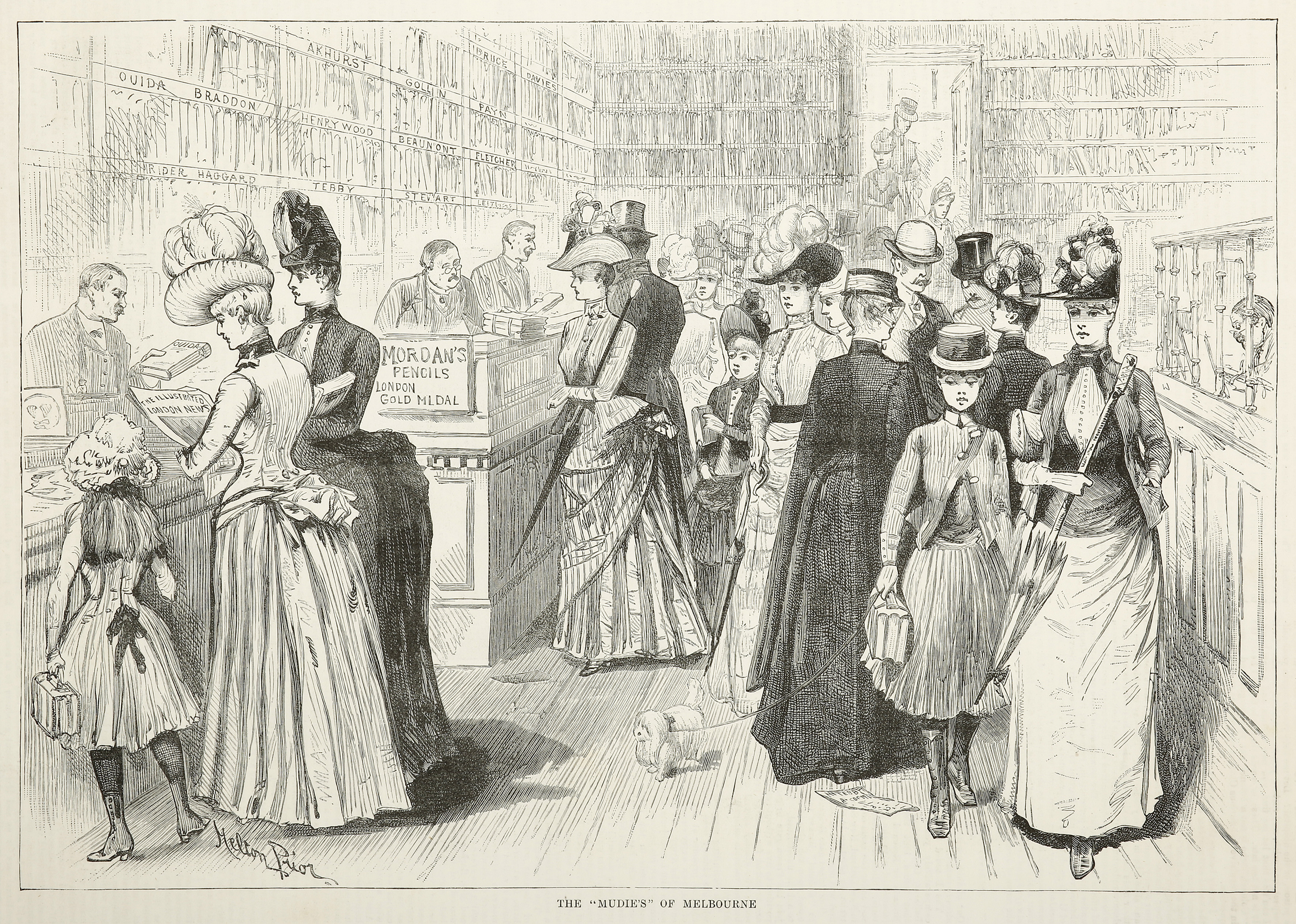Interior view of Samuel Mullen’s, Circulating Library which Mullen’s started based on Charles Edward Mudie’s successful business which had begun as a stationery shop in Upper King Street and from which started lending books in 1842. Mullens store was situated at 35 Collins Street, Melbourne.