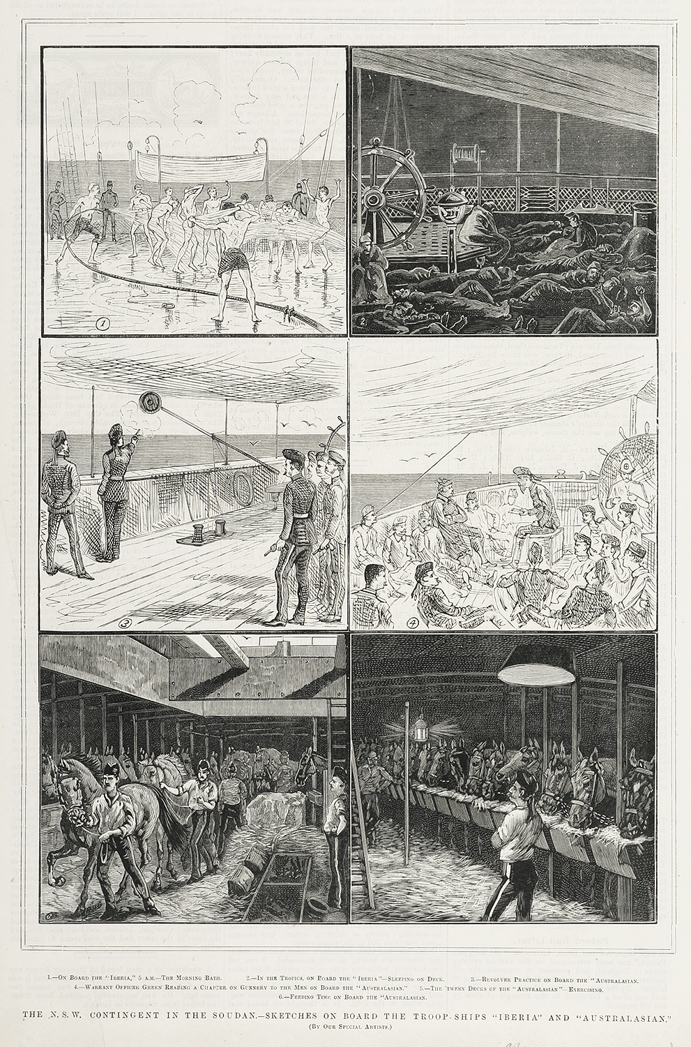 Scarce c.19th engraving of the N.S.W. Contingent on board the troop ships to the Soudan. Insets views; 1.-On board the “Iberia,” 5 a.m.-the morning bath. 2.-In the tropics, on board the “Iberia “-sleeping on deck. 3.-Revolver practice on board the … Read Full Description