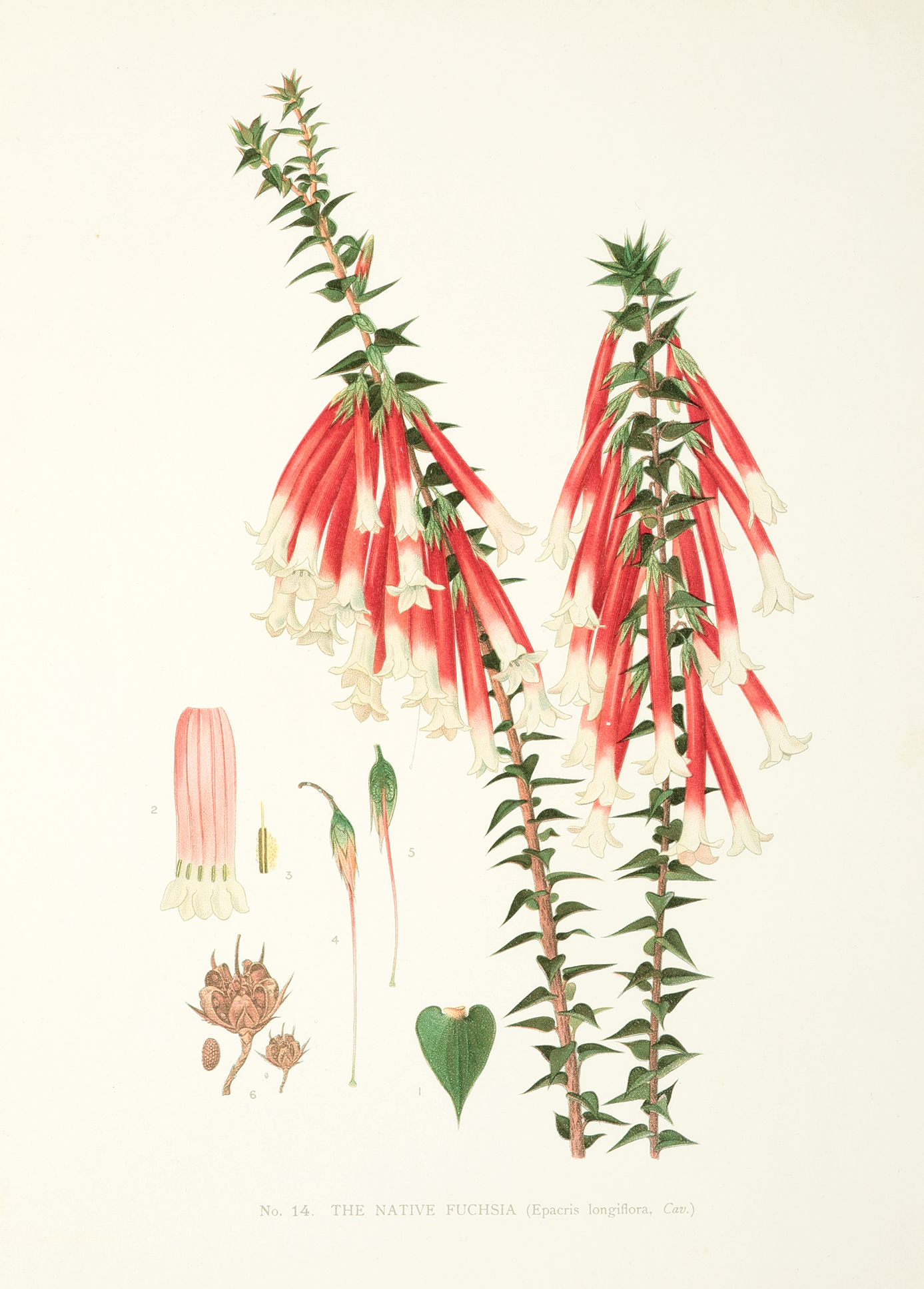 Scarce c.19th lithograph of the fuchsia heath by Joseph Maiden. Common names: fuchsia heath or cigarette flower Modern binomial name: Epacris longiflora First described: Antonio José Cavanilles, 1797 Distribution: QLD, NSW (from south-eastern Queensland to Berry in New South Wales. ) References: … Read Full Description