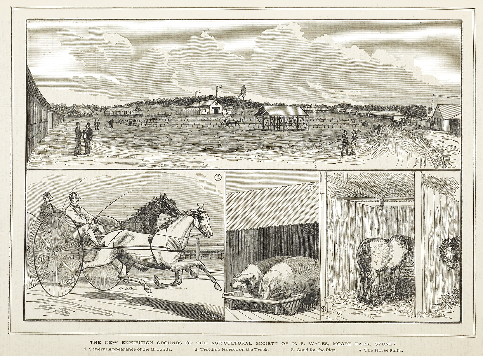 Rare engraving of the show grounds at Moore Park, Sydney. Titles from top clockwise; 1. General Appearance of the Grounds. 2. Trotting Horses on the Track 3. Good for the Pigs. 4. The Horse Stallas. From the original edition of … Read Full Description