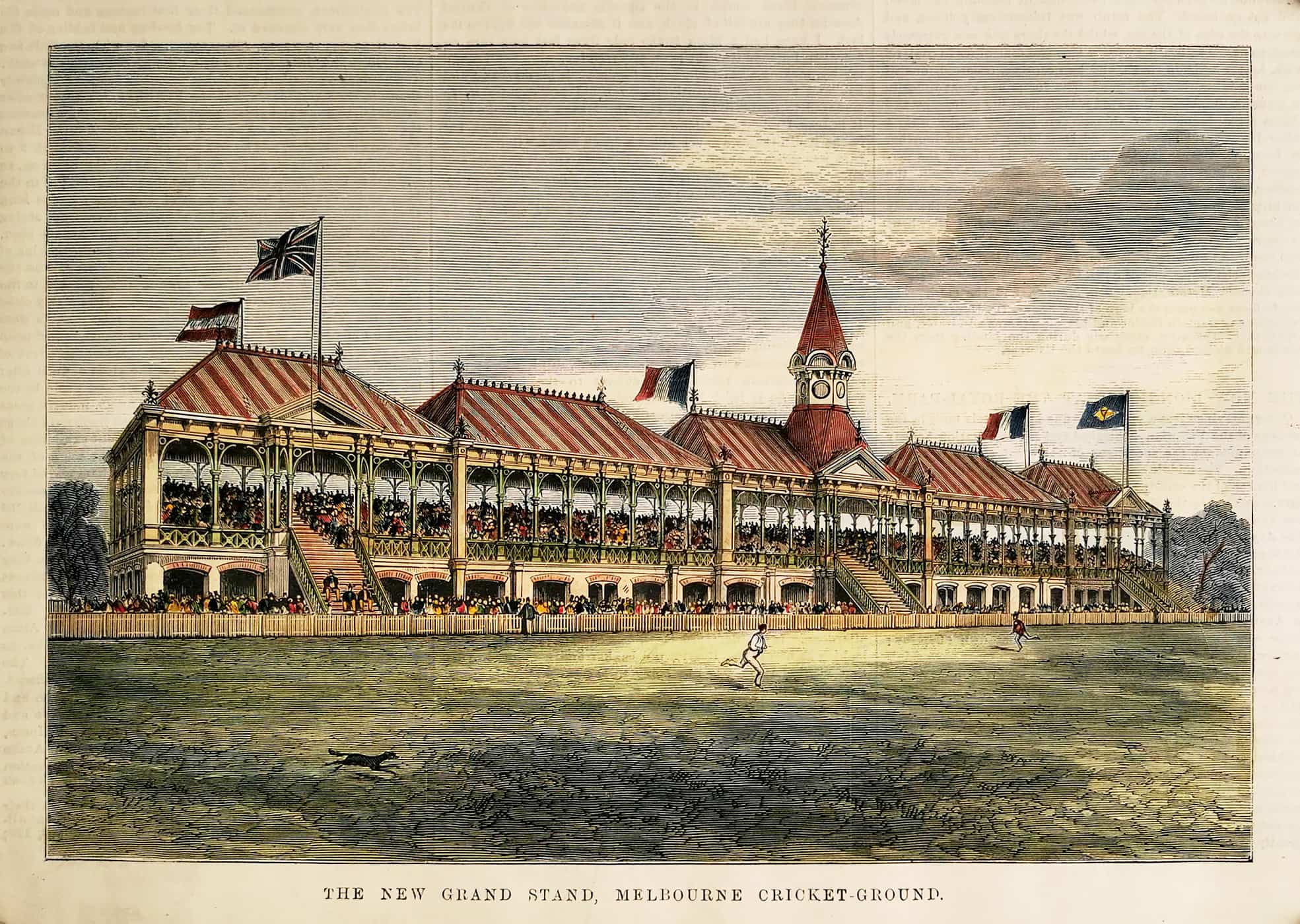 Rare c.19th engraved view of the Melbourne Cricket Ground’s first public grandstand, which was built in time for the First Test in March of 1877 and had a capacity of 2000 spectators.