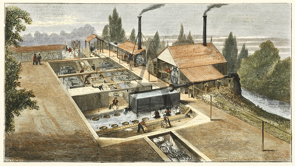 Scarce c.19th engraving of the sheep washing operations at Collaroy sheep station near Merriwa, New South Wales.