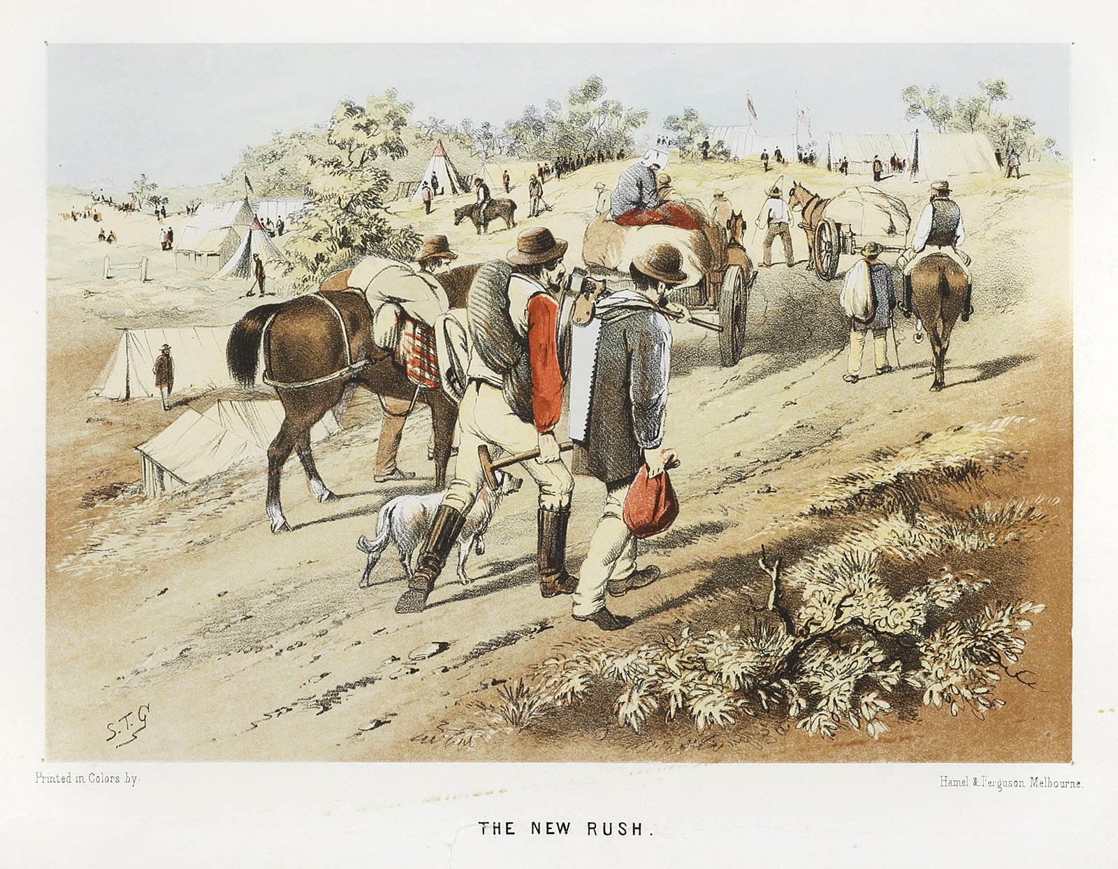 The most sought after image from Samuel Thomas Gill’s, The Australian Sketch Book, depicting prospective miners heading to a new gold field, initialed S.T.G. lower left.