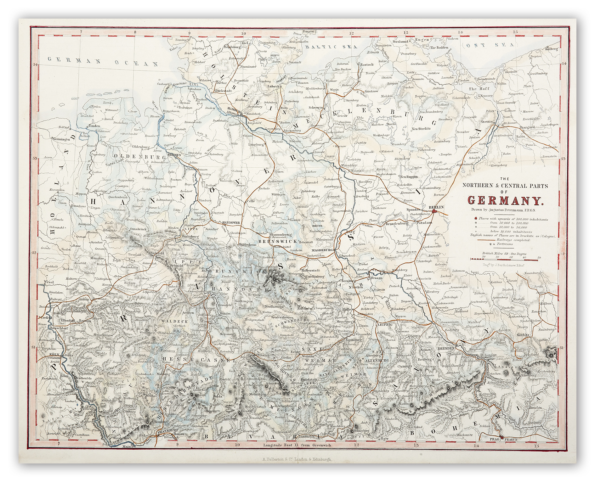 In 1847, Petermann moved to London and in 1850 founded his own establishment: The Geographical Establishment, Engraving, Lithographic and Printing Office. In 1852 Ernst Georg Ravenstein (1834–1913) was apprenticed to him, before he went in 1855 into the service of the Topographical Department of the British War Office.