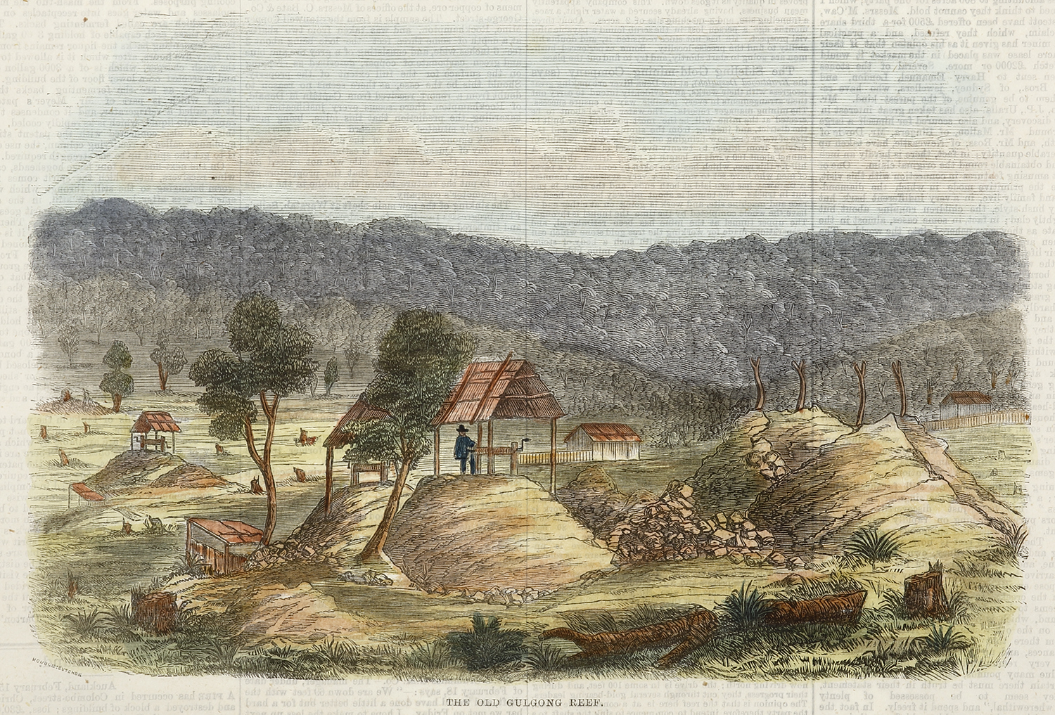 Very rare engraved view of of the Royal George Reef at the Gulgong diggings. The Royal George Reef was situated 12 km south of Gulgong, a series of parallel quartz veins trending north 20° are localised within slates of the Tinja Formation.