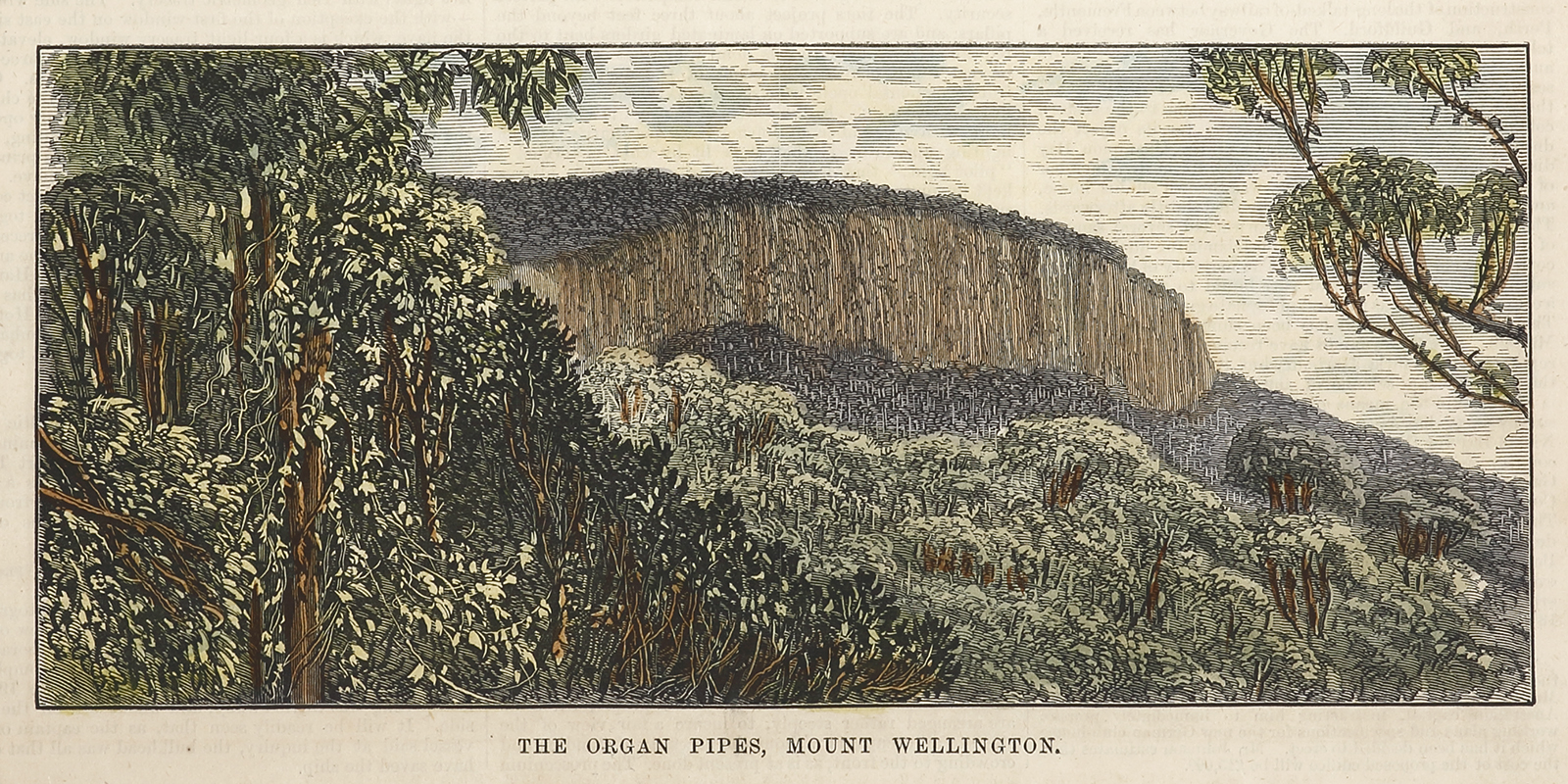 Scarce c.19th hand coloured engraving of the magnificent Mount Wellington, Organ pipes.