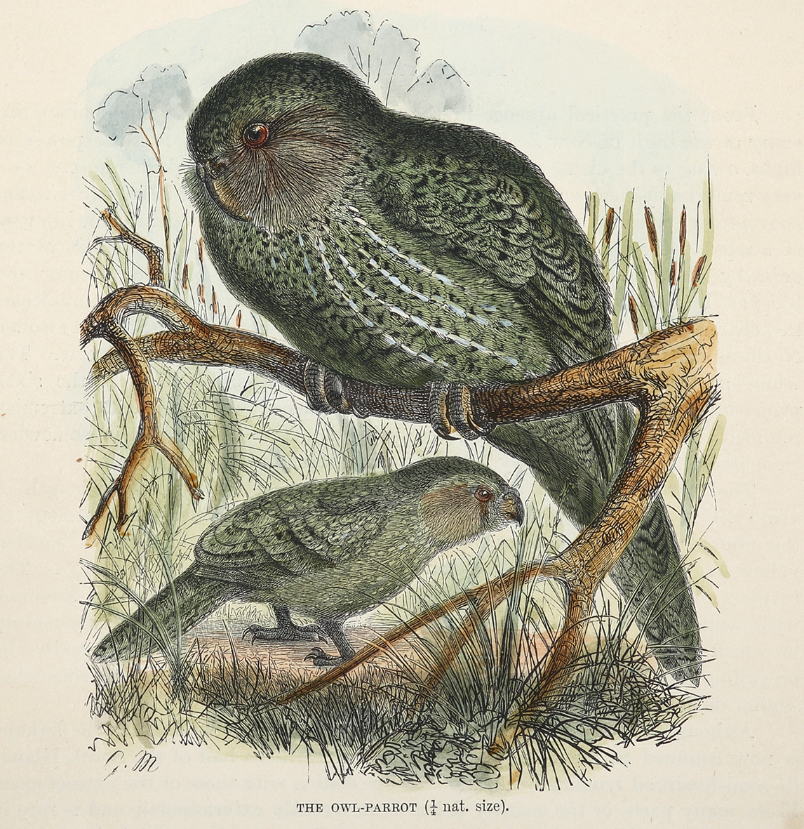 Scarce c.19th hand coloured engraving of the Kakapo, the world’s largest ground parrot.