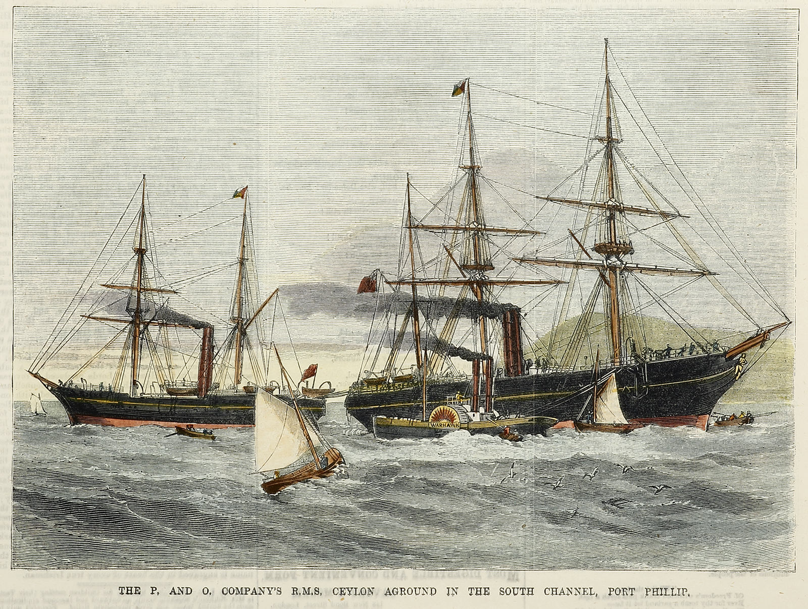 The P. and O. Company's R.M.S. Ceylon Aground in the South Channel, Port Phillip. - Antique View from 1875