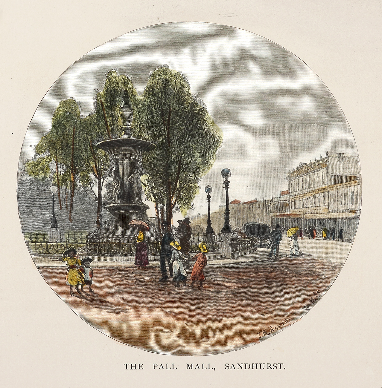 Scarce c.19th hand coloured engraving of Bendigo’s Pall Mall, which is lined with historic buildings, including the courthouse, GPO and military museum.