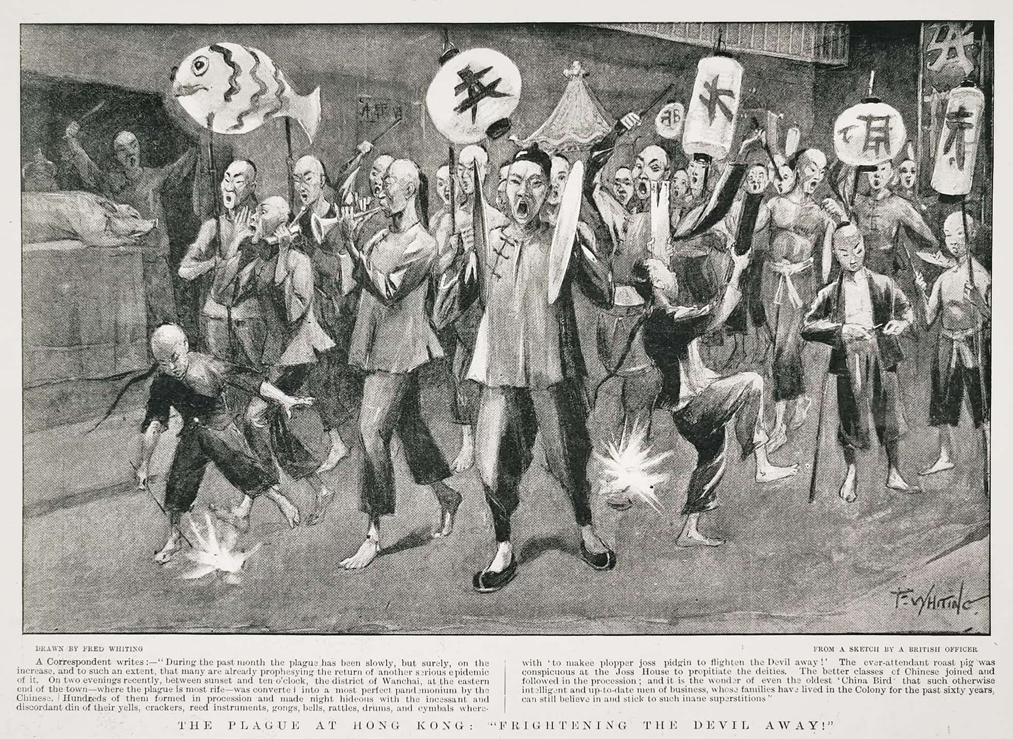 Procession of Chinese in Hong Kong warding off the Plague in 1901 in Hong Kong. From the original edition of The Graphic.