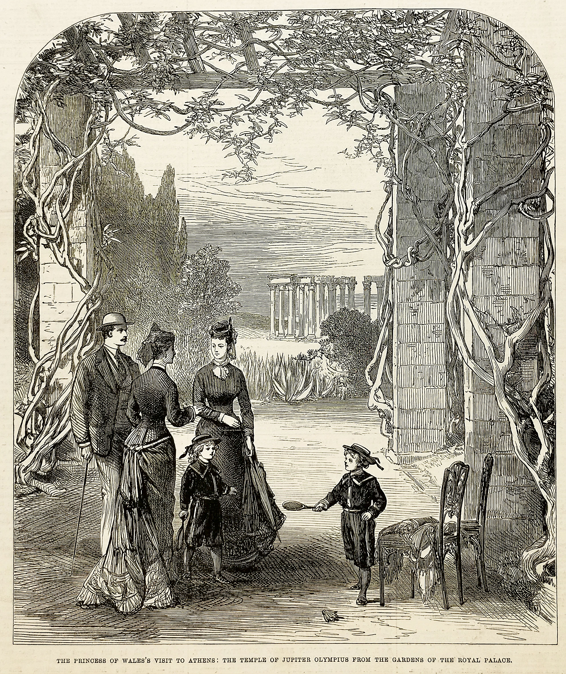 The Princess of Wales's Visit to Athens, the Temple of Jupiter Olympius from the Gardens of the Royal Palace. - Antique Print from 1877