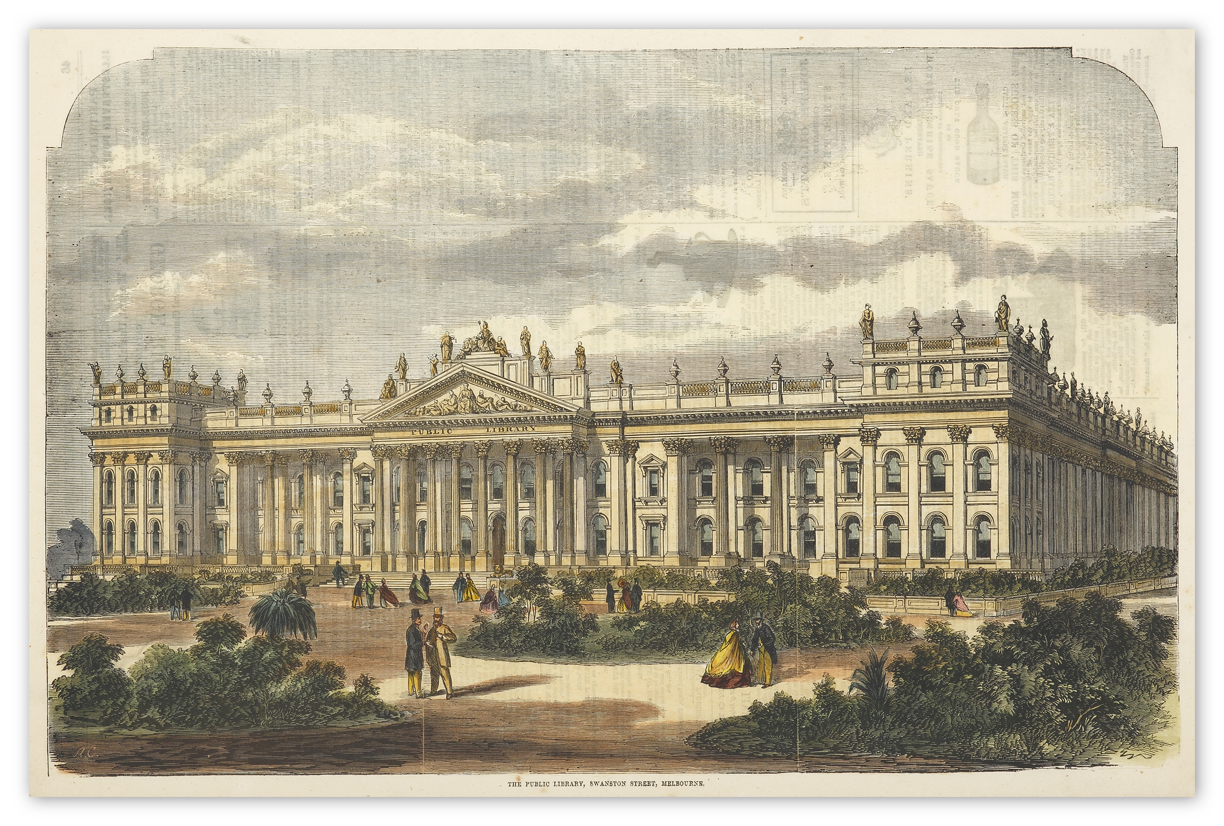 Large colonial engraving of the Melbourne Library. From the original edition of the Illustrated Sydney News.