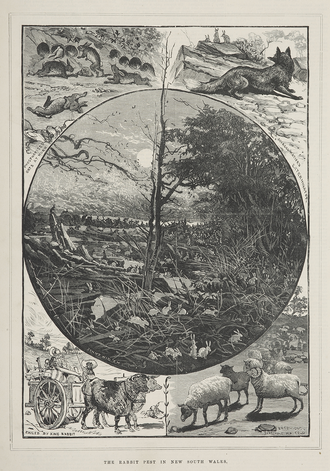 Scarce engraving showing the rabbit problem in New South Wales in 1883.
