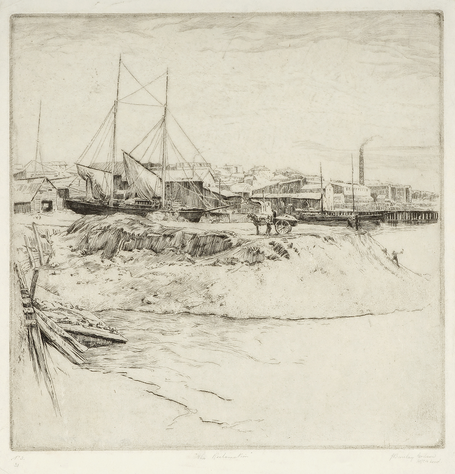 Fine etching by the master print maker John Barclay Godson of possibly Pyrmont or Darling Harbour. With the letters ARCA Lond. [Associate of the Royal College of Art] at lower right after his signature. Godson first exhibited this etching at … Read Full Description