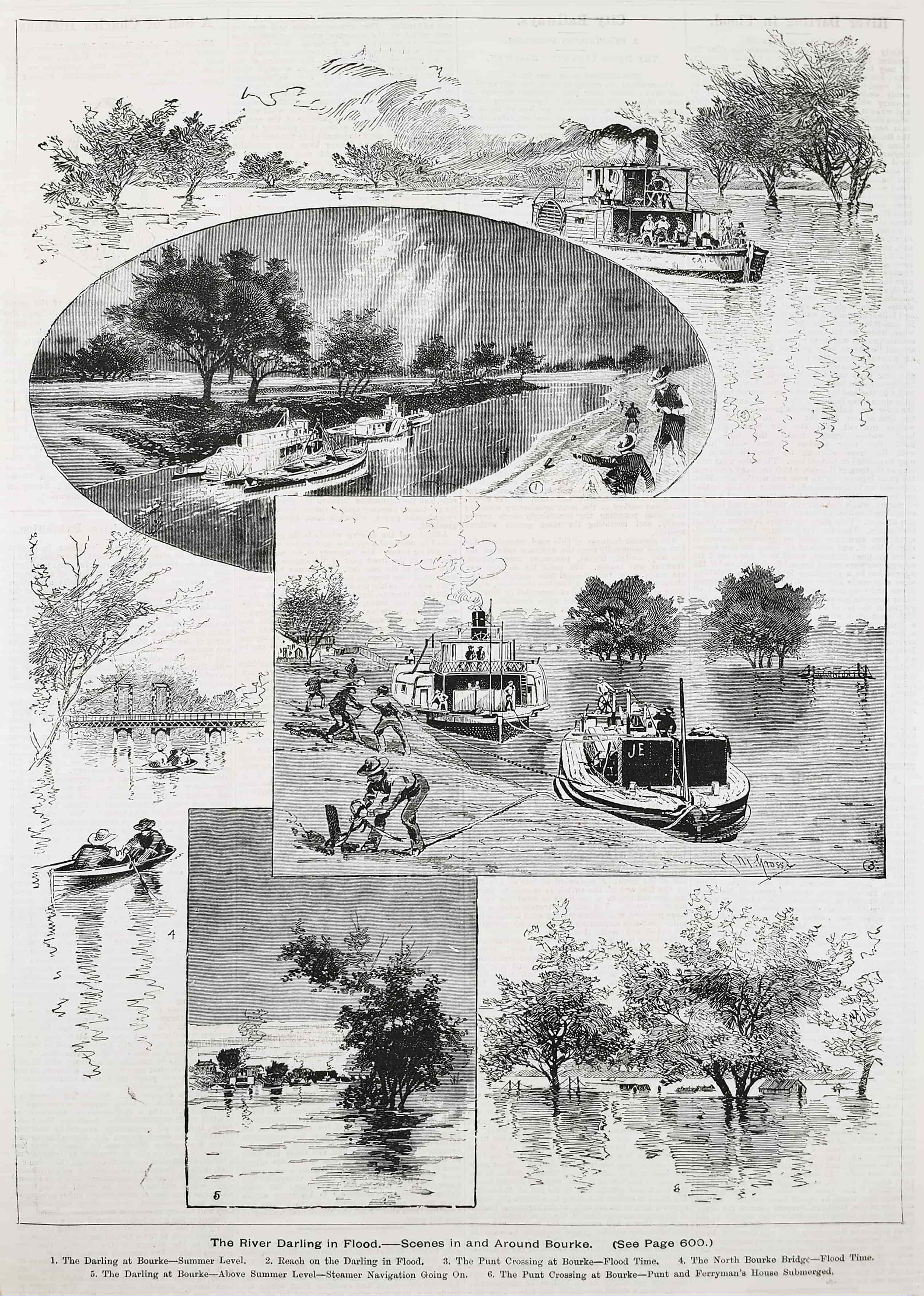 Rare c.19th engraving of the Darling River at Bourke in flood, showing a number of paddle steamers. From the original edition of the Town and Country Journal.