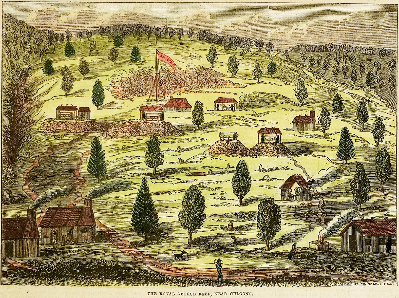 Very rare engraved view of of the Royal George Reef at the Gulgong diggings. The Royal George Reef was situated 12 km south of Gulgong, a series of parallel quartz veins trending north 20° are localised within slates of the Tinja Formation. The deposit was worked during 1870-1871, and again from 1878-1879, but there has been no recorded production.