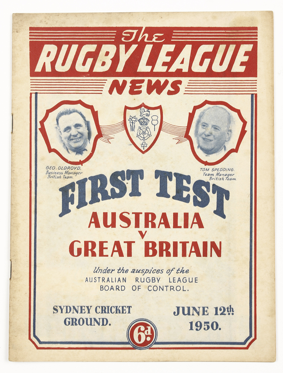 Scarce program for the First Test between Australia v Great Britain at the Sydney Cricket Ground June 12, 1950. 22p, soft bound printed in green on yellow paper pictorial cover. Great Britain defeated Australia 6–4 crowd attendance 47,275