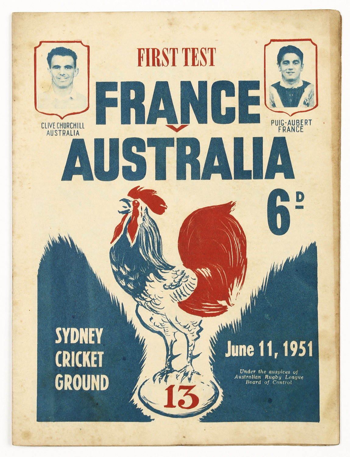 Scarce program for the First Test between France vs Australia at the Sydney Cricket Ground June 11, 1951. 22p, soft bound printed in green on yellow paper pictorial cover. France defeated Australia 26–15 crowd attendance 60,160
