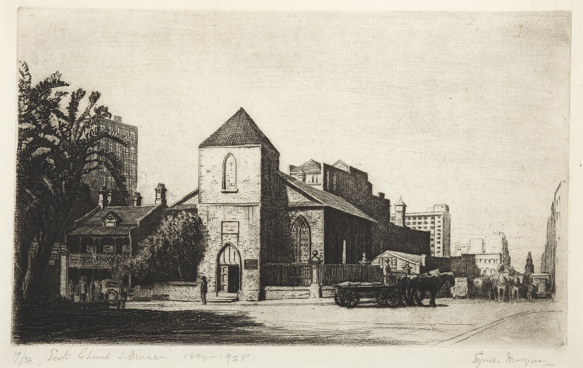 Morgan etched two versions of this church, this being the earlier scarer version of the two. There are substantial differences between the two versions, in the later version:The car at left has been removed Six figures have been added to … Read Full Description