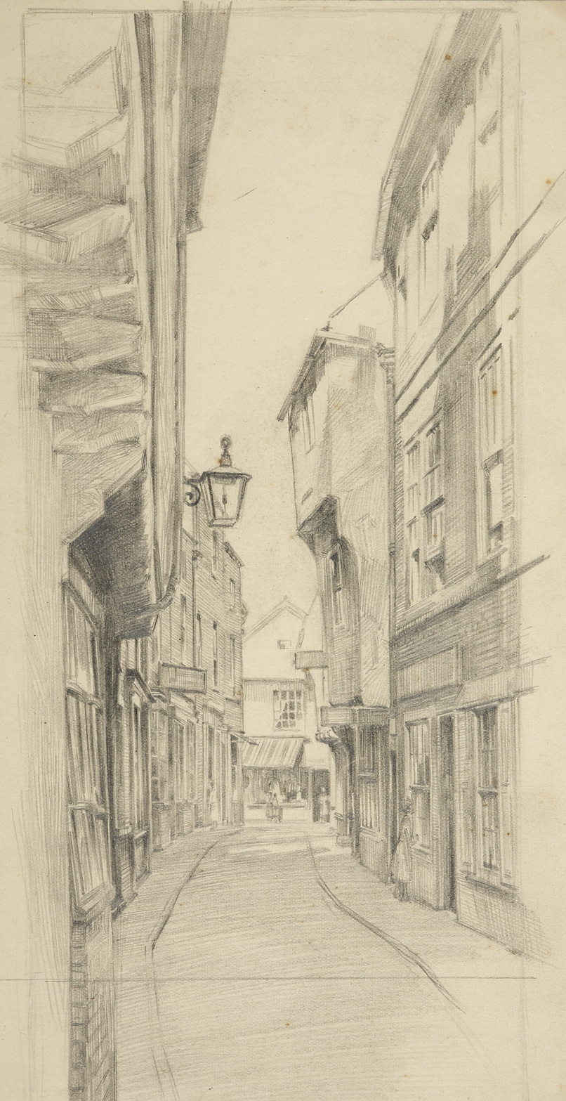 Original pencil drawing and the etching by the master print maker John Barclay Godson of The Shambles, York, England.