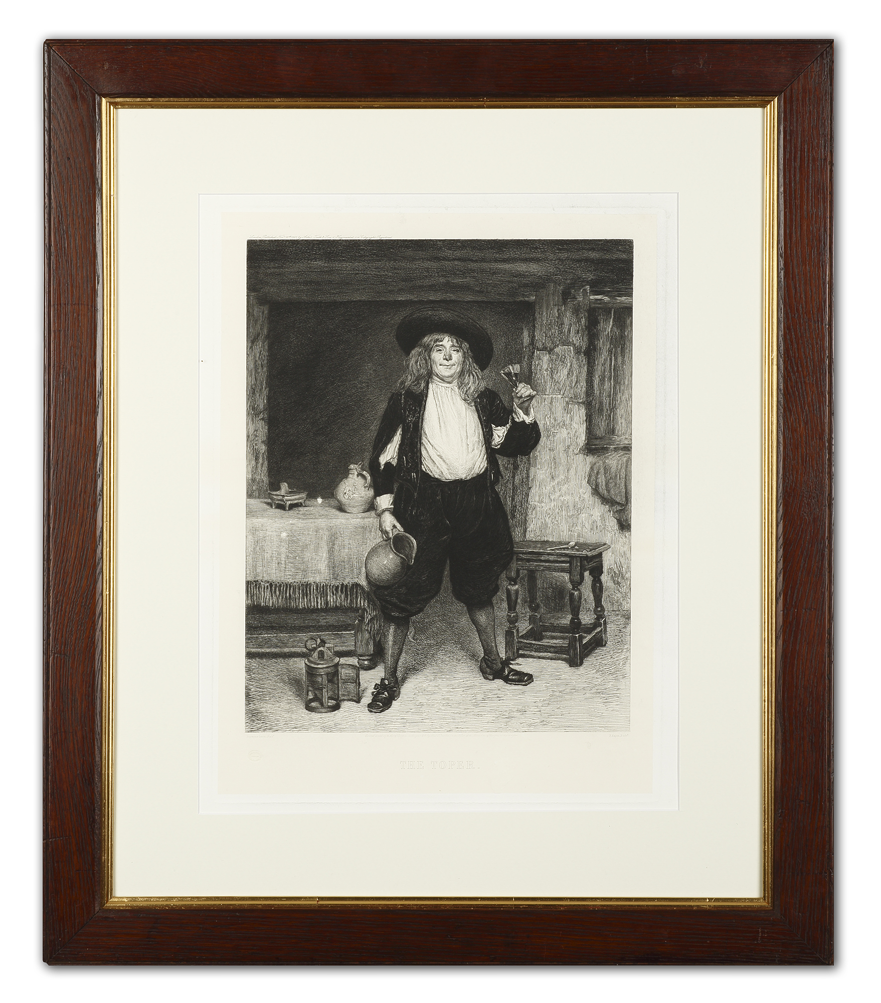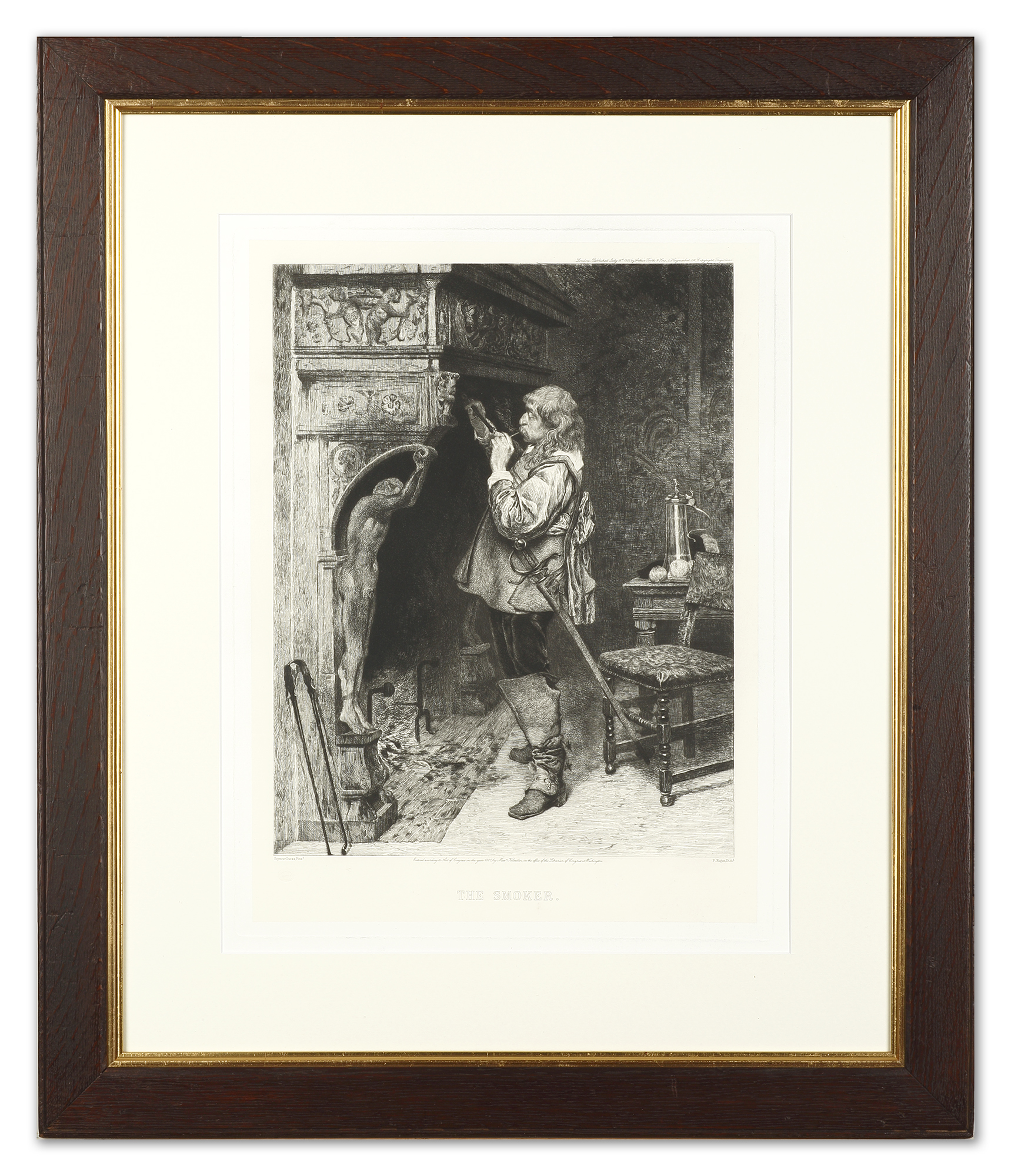 Pair of large c.19th etchings by John Seymour Lucas (1849-1923) one of a gentleman lighting his pipe in front of a huge fireplace with an oak table and farthingale chair. The farthingale chair was an armless chair with a wide seat covered in thick fabric, fitted with a cushion and upholstered backrest. It was introduced as a chair for ladies in the late 16th century and was named in England, probably in the 19th century, for its ability to accommodate the exceptionally wide-hooped skirts known as farthingales. The other of a drinker holding a a large jug and filled glass in his hand.