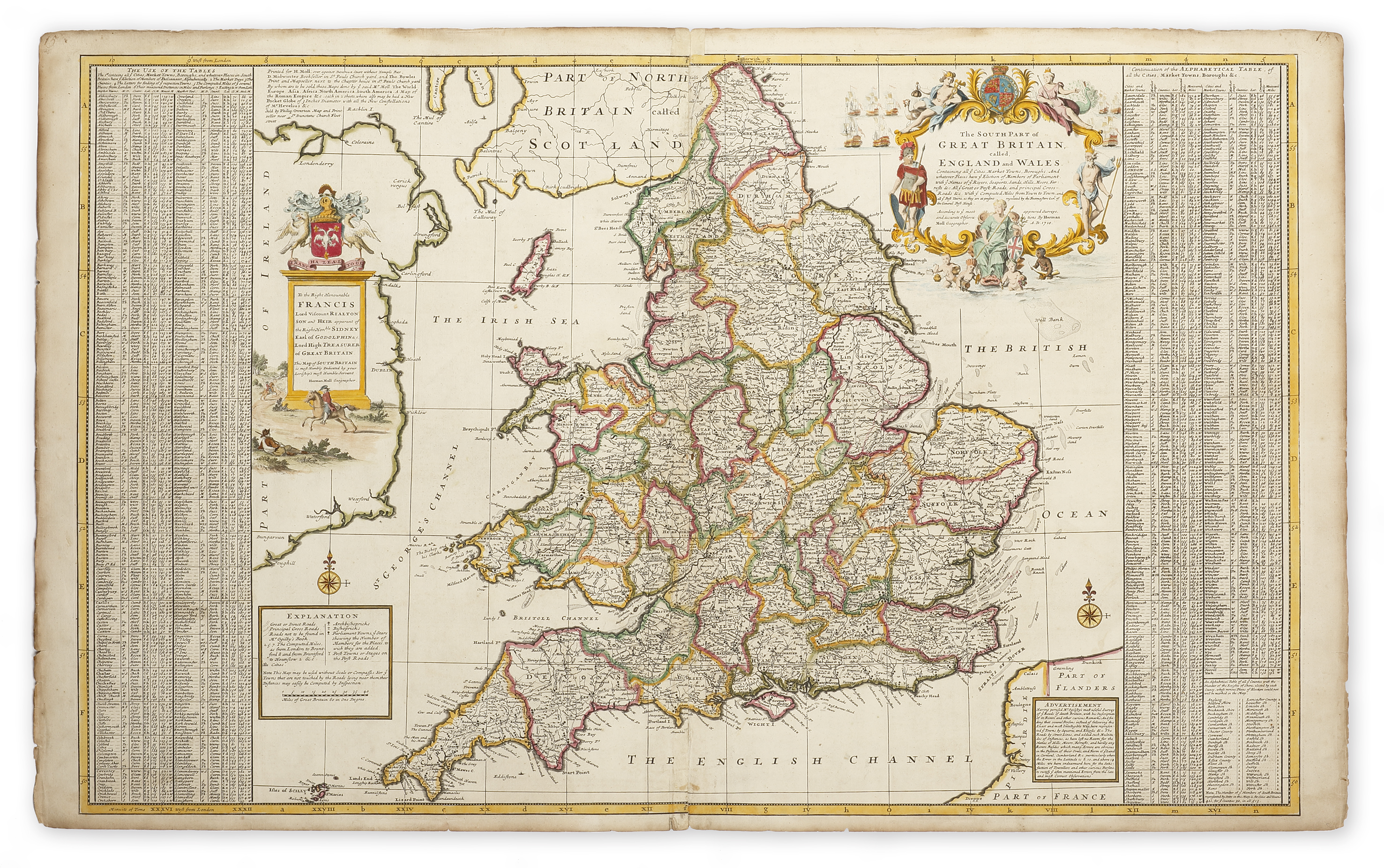 Molls spectacular two sheet map of England and Wales from his spectacular large atlas, The World Described. There is an elaborate title cartouche at top right and at left, there is an illustrated dedication to ‘The Right Honorouble Lord Viscount Rialton’. William Godolphin, Marquess of Blandford (1700 – 24 August 1731) was an English nobleman and politician. He was born the eldest son of Francis Godolphin, 2nd Earl of Godolphin. In 1712 his father succeeded as 2nd Earl of Godolphin (Lord Godolphin had been promoted in 1706). As heir-apparent to the earldom, William assumed the courtesy title Viscount Rialton.
