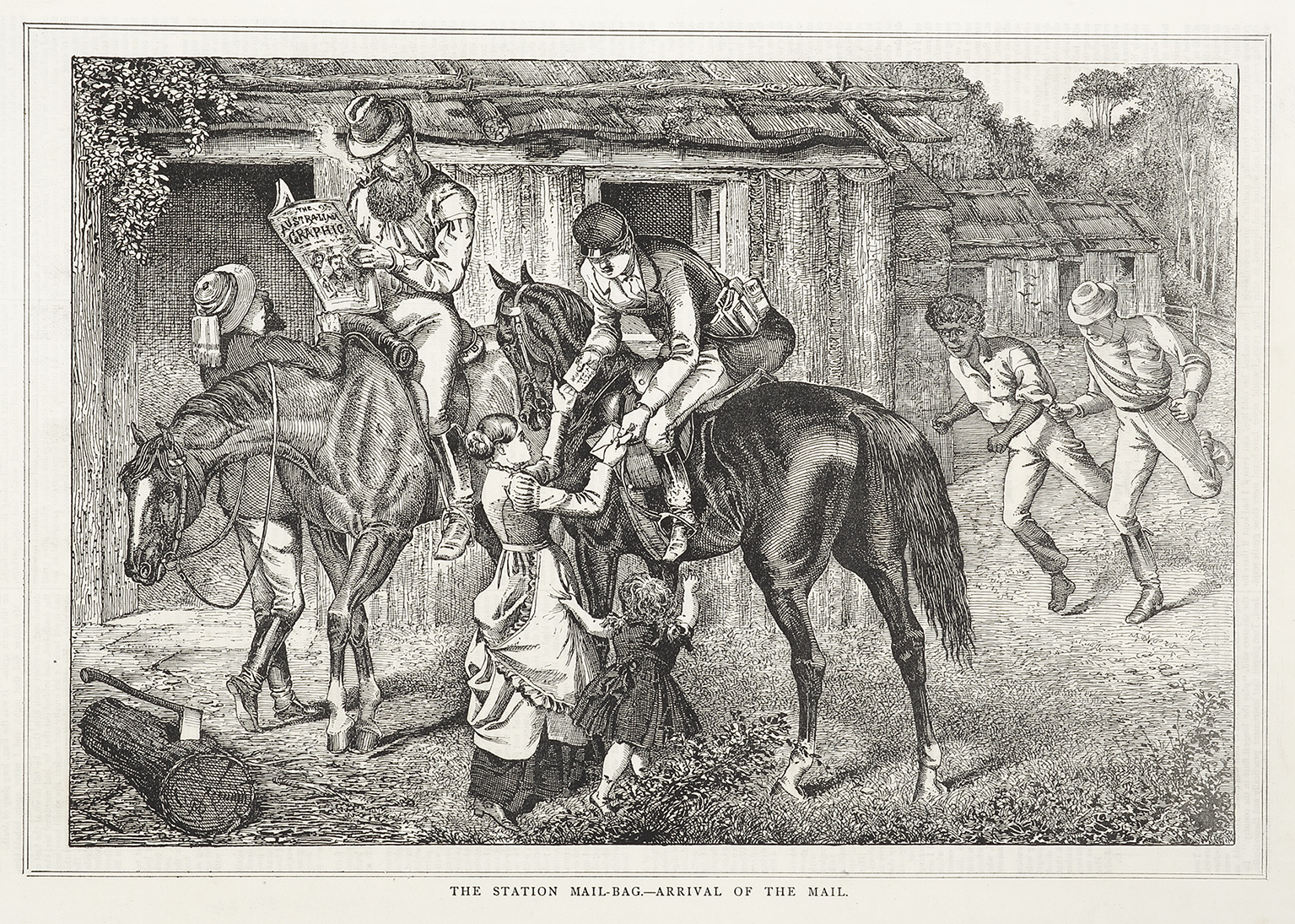 Very rare engraving of Australian bush life showing the delivery of the mail at a station. The mn on horseback is reading a copy of The Australian Graphic.