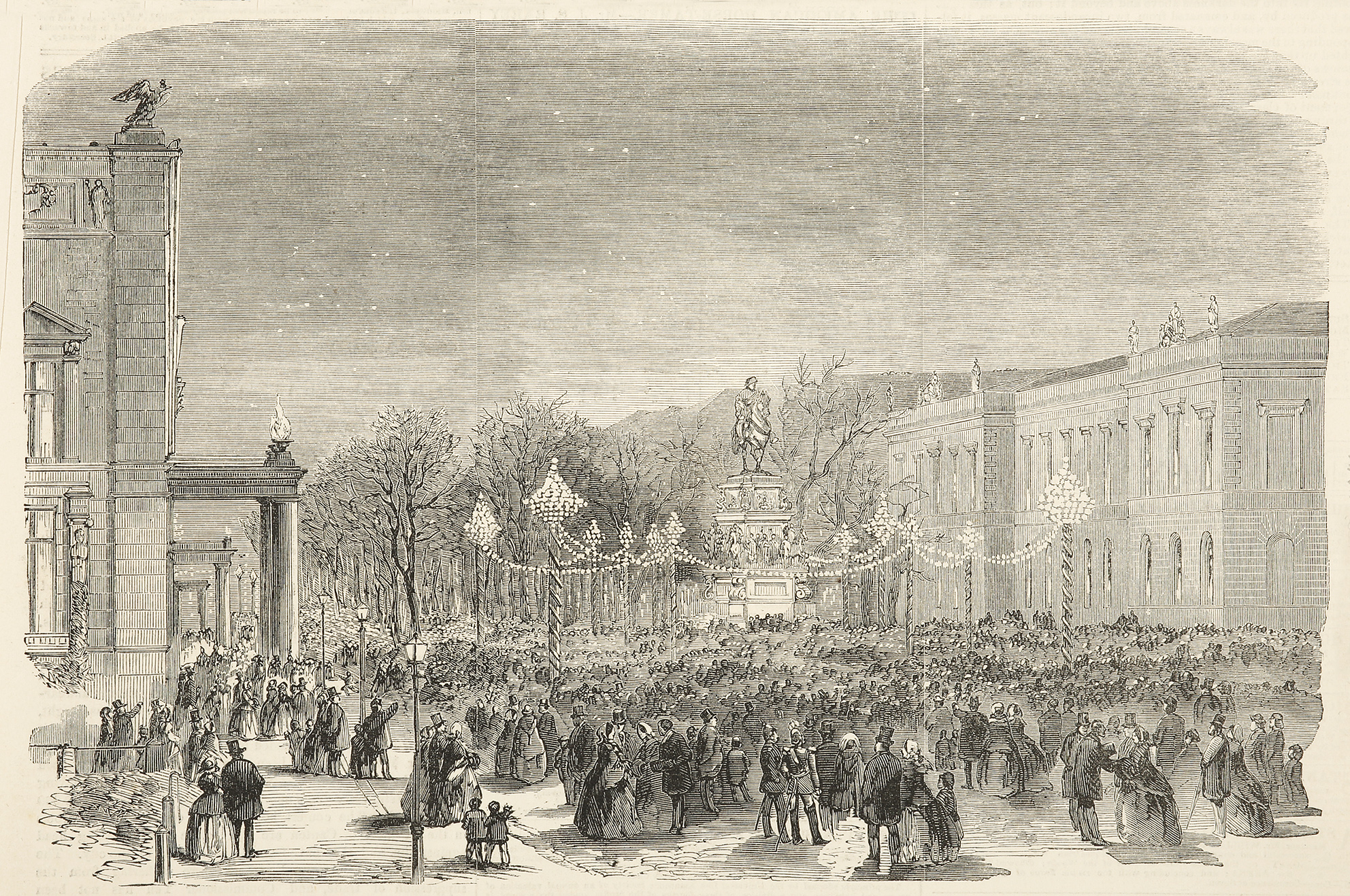A street scene of people gathered to honouring the unveiling of the statue of King Frederick II of Prussia.