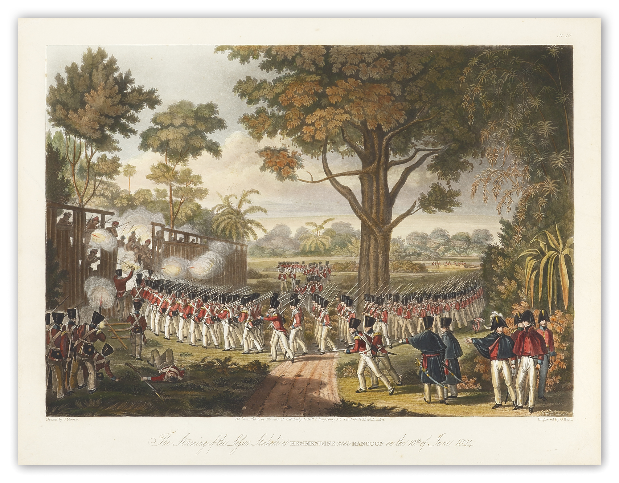 Rare c.19th aquatint the British troops at Kemmendine (Kyimyindaing Township), near Rangoon, Mymar (Burma), from the important visual record of the Burmese countryside and scenery, and of the war between the Burmese and British in 1824 to 1826 by Ltn. Joseph Moore.