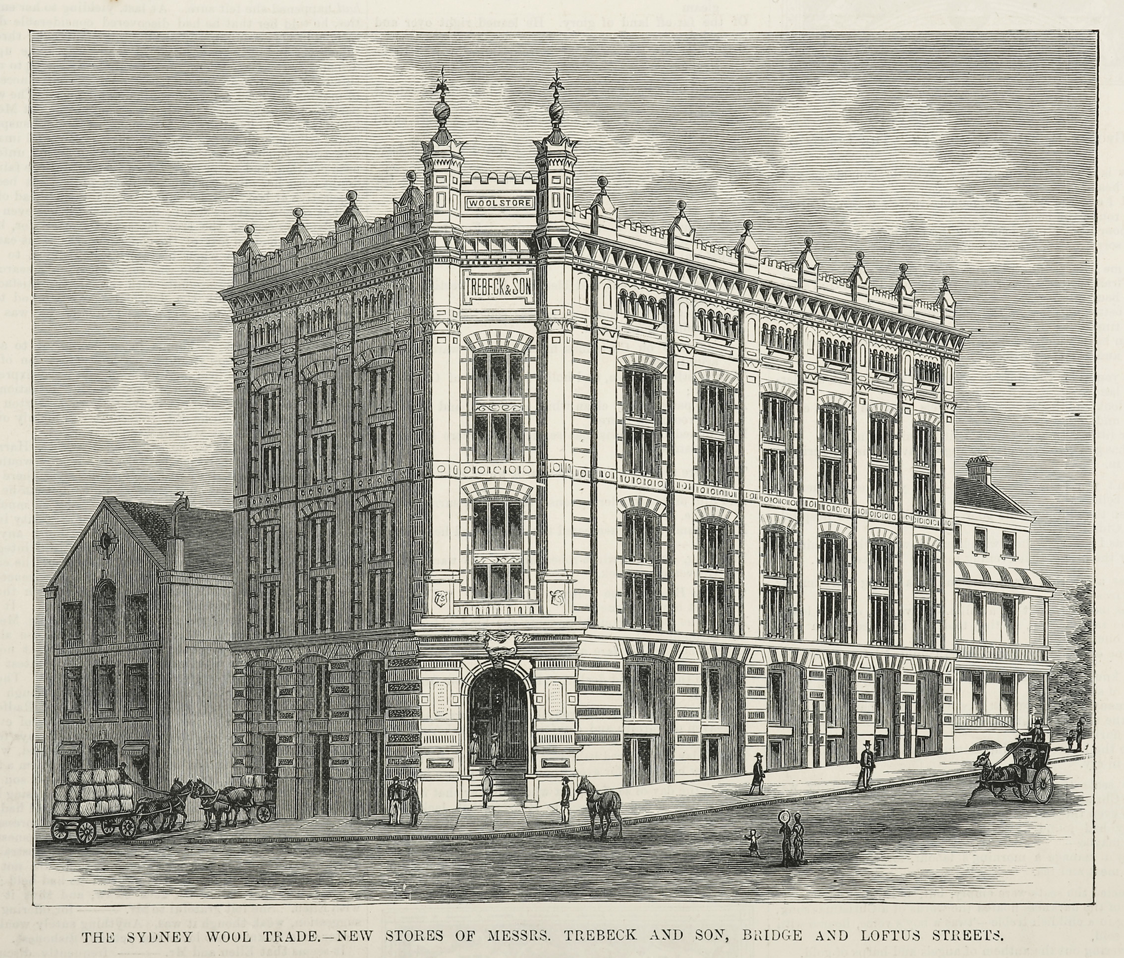 Rare engraving of Prosper Charles Trebeck and sons building on the corner of Bridge and Loftus Street, Sydney.