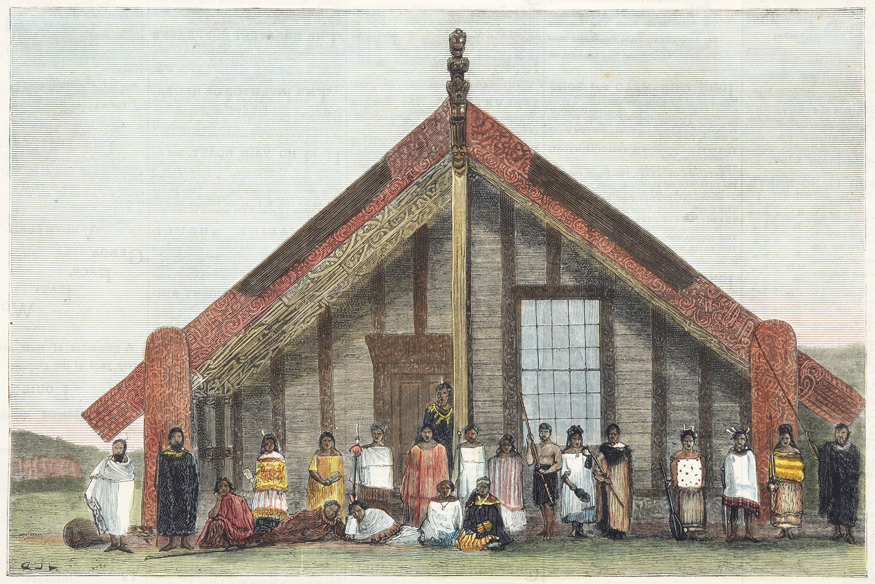 Engraved view of a group of Maoris in front of their meeting house.