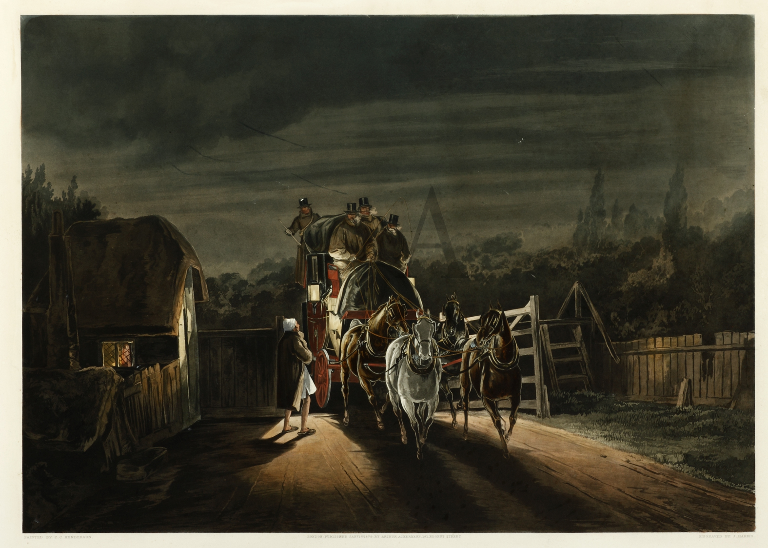 In 18th century England many roads were regulated through Acts of Parliament which allowed bodies of local trustees to levy tolls on the users of a specified stretch of road, generally around 20 miles in length. The tolls were applied at the turnpikes which were usually gated. Set on a star studded night a four-in-hand is let through the turnpike by the gate keeper still in his night attire.