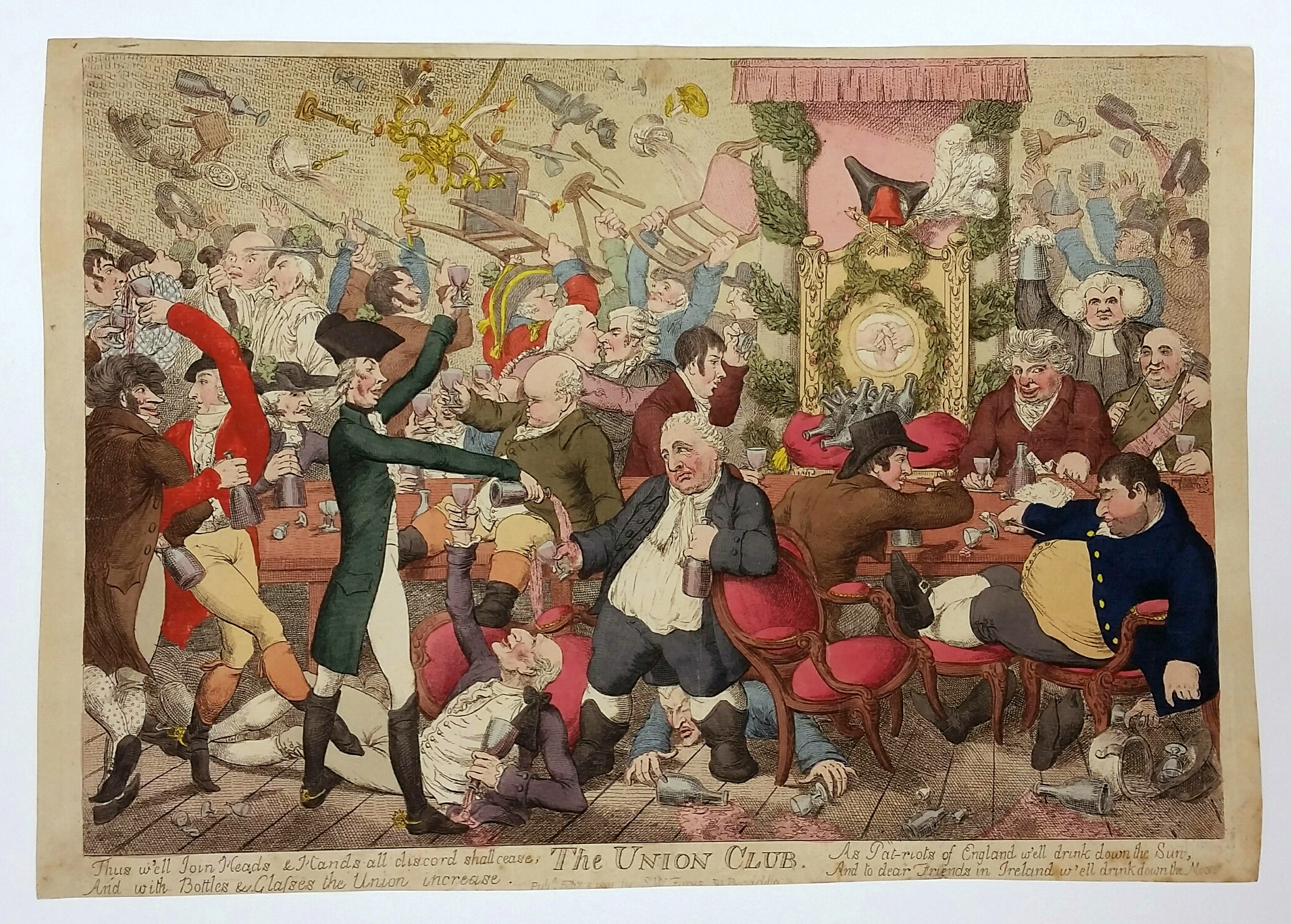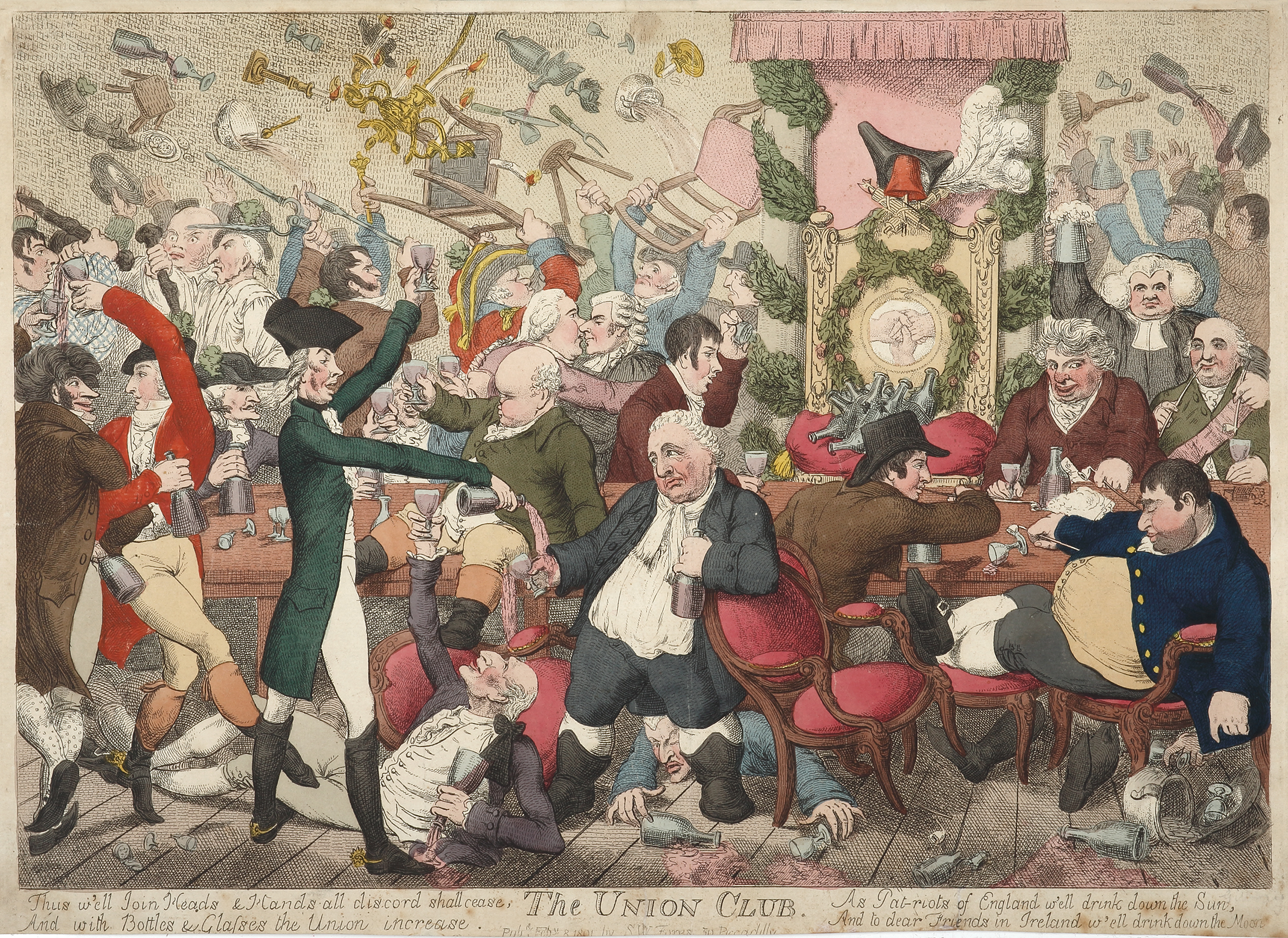 Scarce satirical etching by James Gillray after the long-awaited implementation of the Acts of Union which brought England and Ireland together as the United Kingdom, and more specifically the opening of the Union Club (on January 19th) that was intended to foster common interests between the countries.