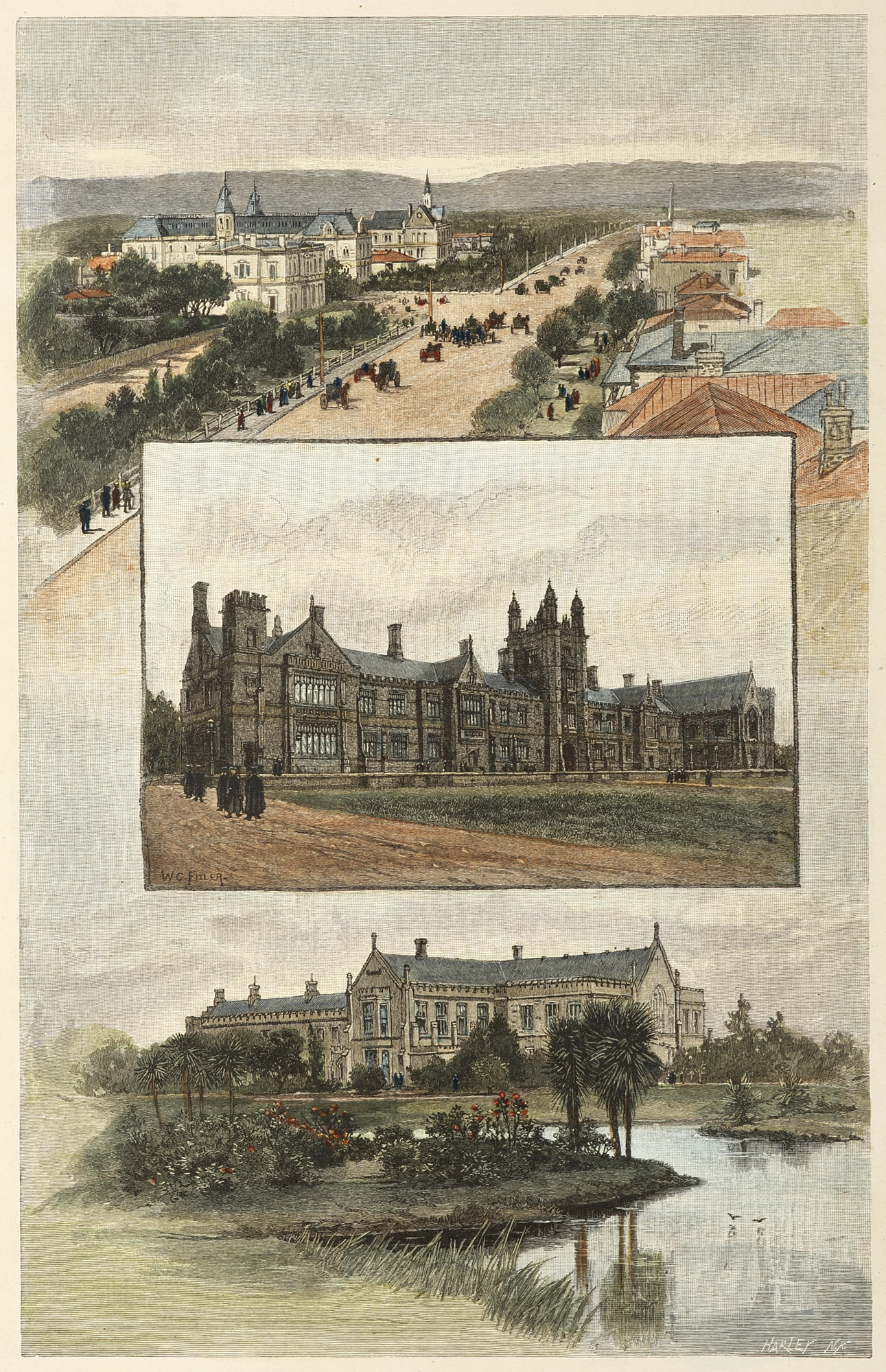 Scarce c.19th hand coloured engraving of: Adelaide University, Sydney University and Melbourne University.