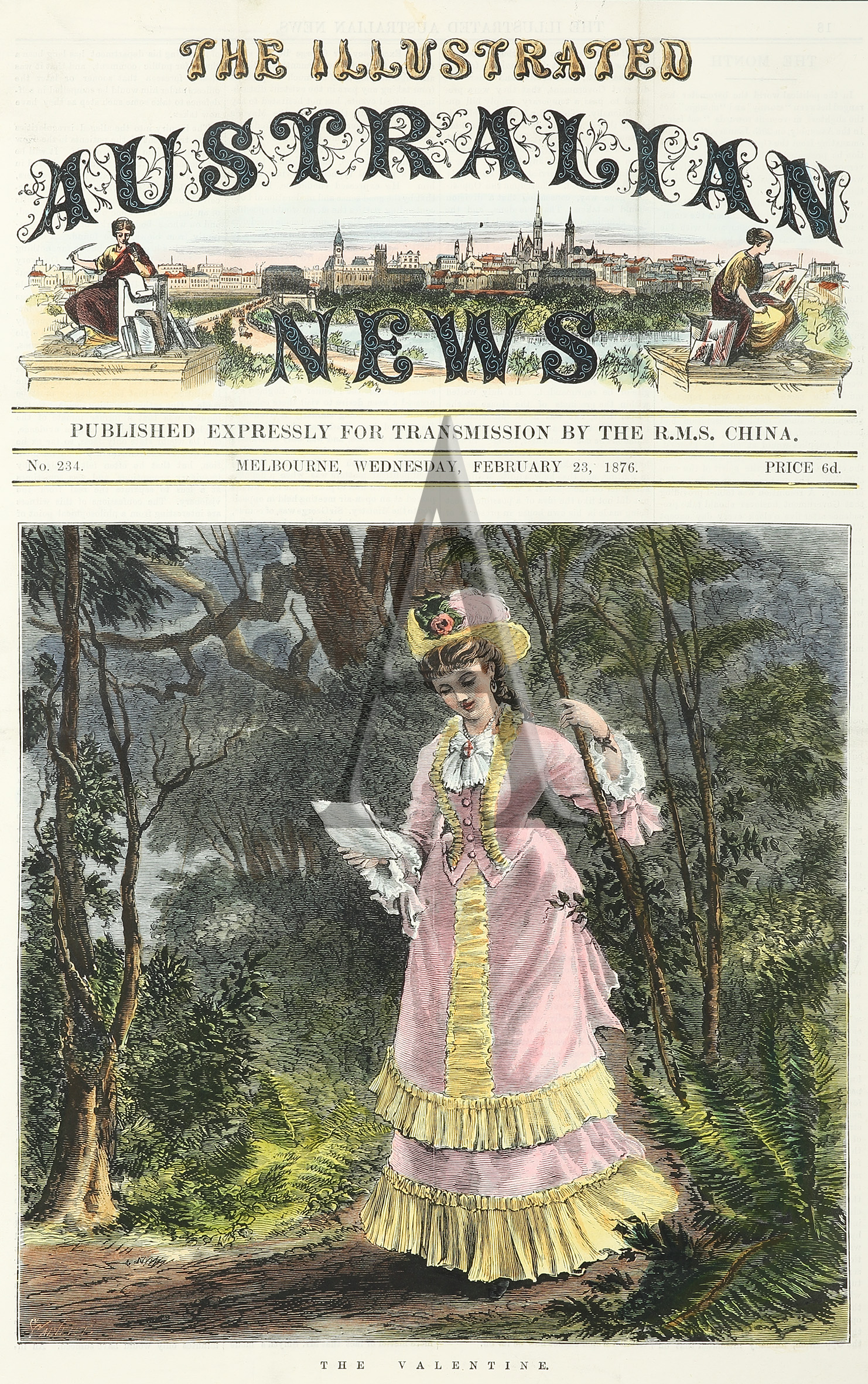 Wonderful pictorial title page from the original edition of the Illustrated Australian News, for Wednesday, February 23, 1876, a well dressed young woman reading her valentine letter.