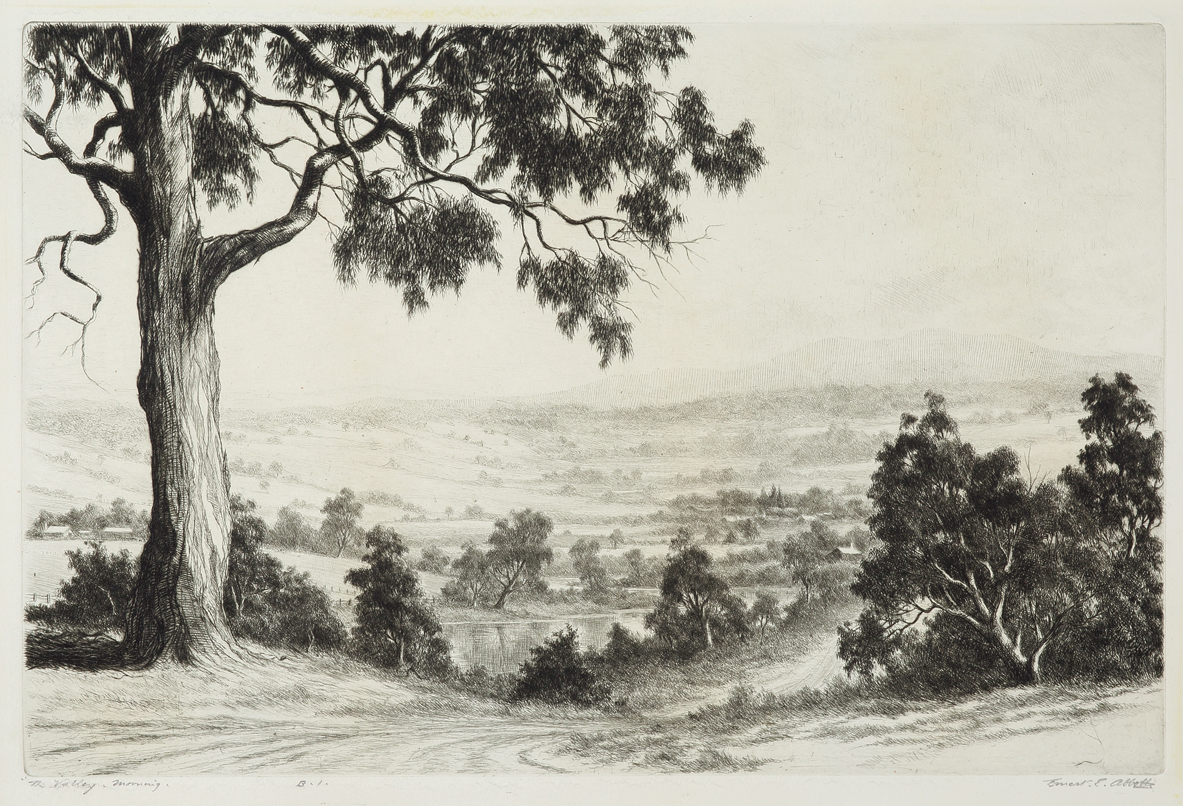 Fine etching of an Australian landscape by Edwin Ernest Abbott.
