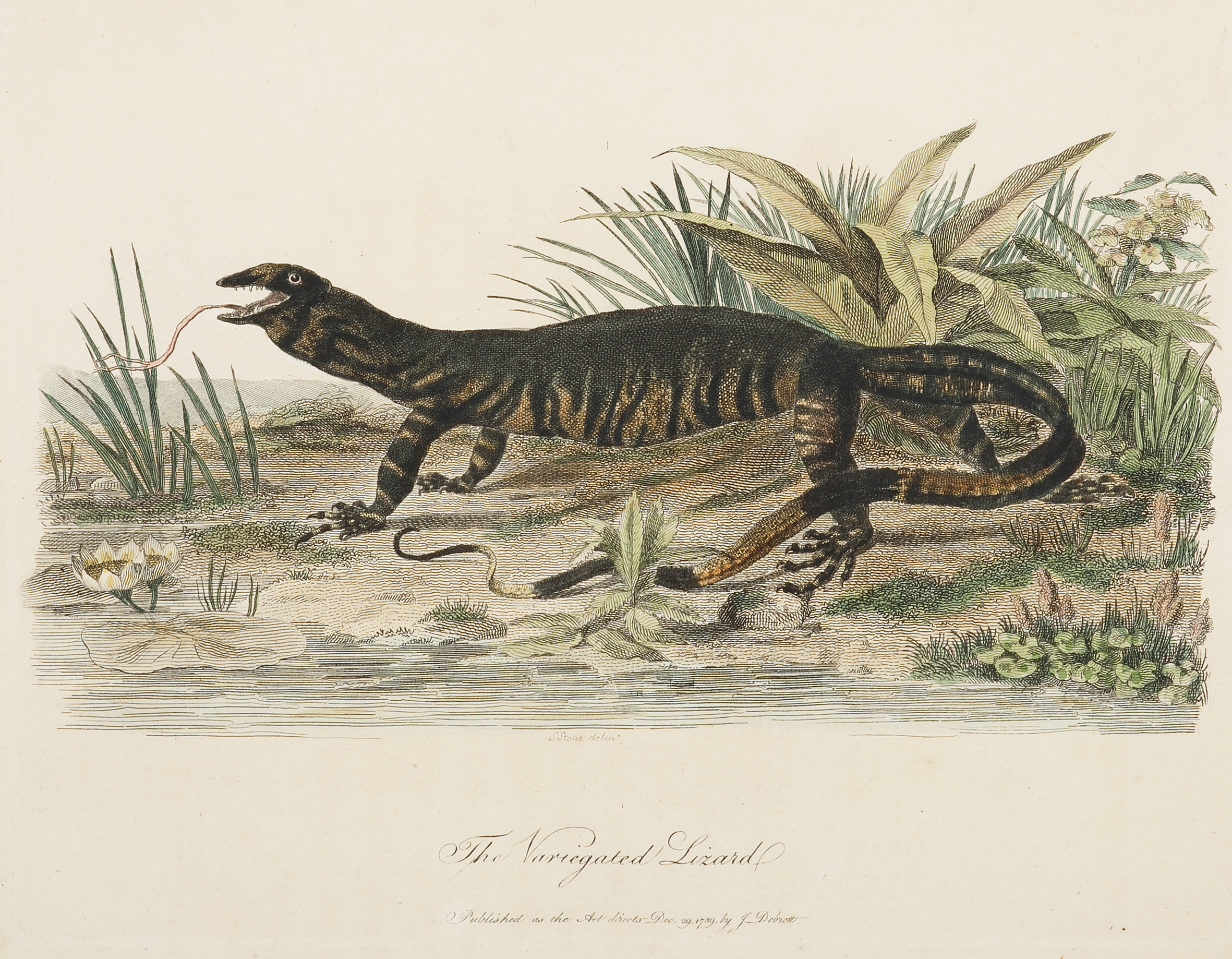 Rare c.18th engraving of the Lace Monitor, Lace Goanna or Tree Goanna by Sarah Stone (1760-1844). “This Lizard approaches so extremely near to the Lacerta Monitor of Linnaeus, or Monitory Lizard, as to make it doubtful whether it be not … Read Full Description
