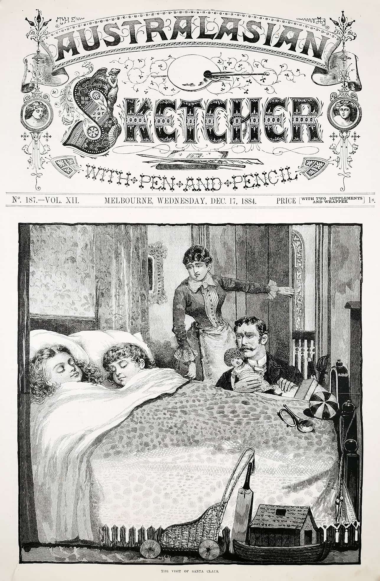 Engraving of children waiting for Santa Claus. From the original edition of the Australasian Sketcher.