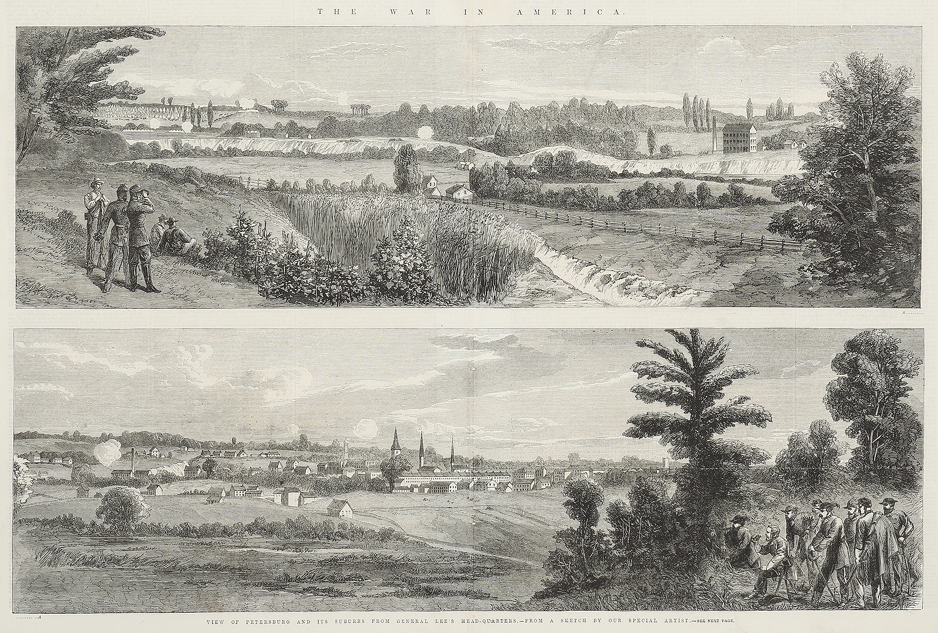 Large c.19th engraving of the town of Petersburg from General Lee’s base during America’s Civil War.