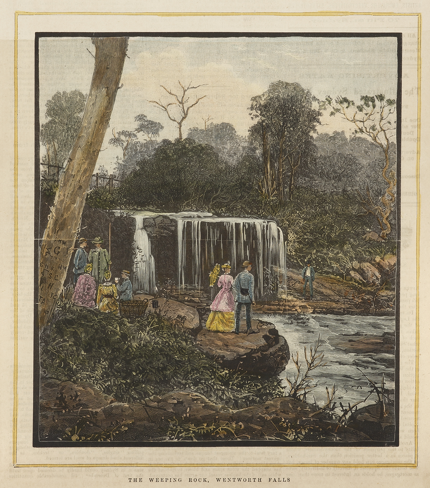 Scarce colonial engraved scene of Wentworth Falls, Weeping Rock, where Jamison Creek spills over a rock overhang in the Blue Mountains. From the original edition of the Illustrated Sydney News. Collections: State Library New South Wales: F8/39-40 State Library Victoria: … Read Full Description
