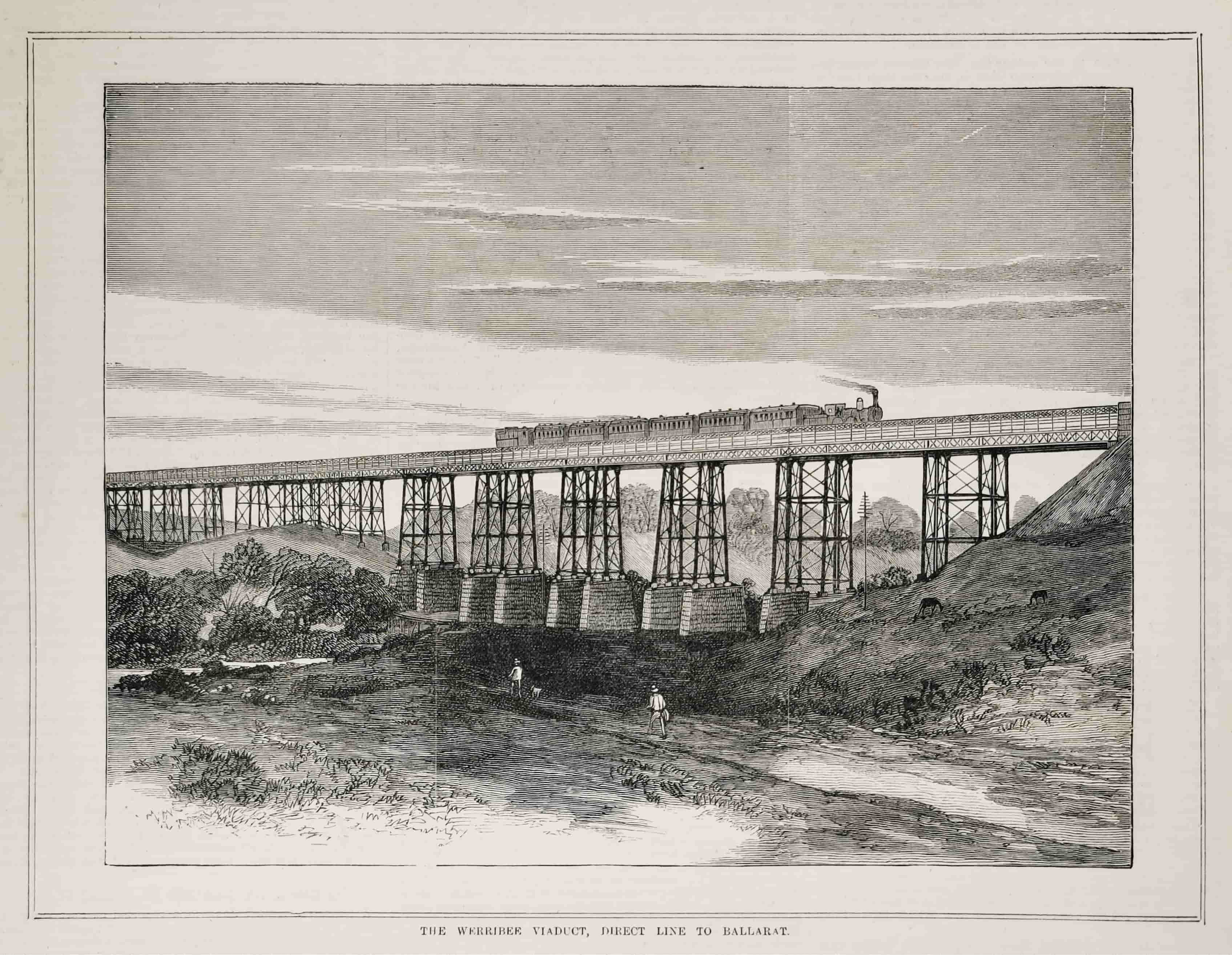 Scarce colonial engraving of the Melton viaduct. The 357-metre viaduct carries the Serviceton railway line over the valley of the Werribee River, built in 1885 by Victorian Railways to establish a direct rail route between the cities of Melbourne and Ballarat.