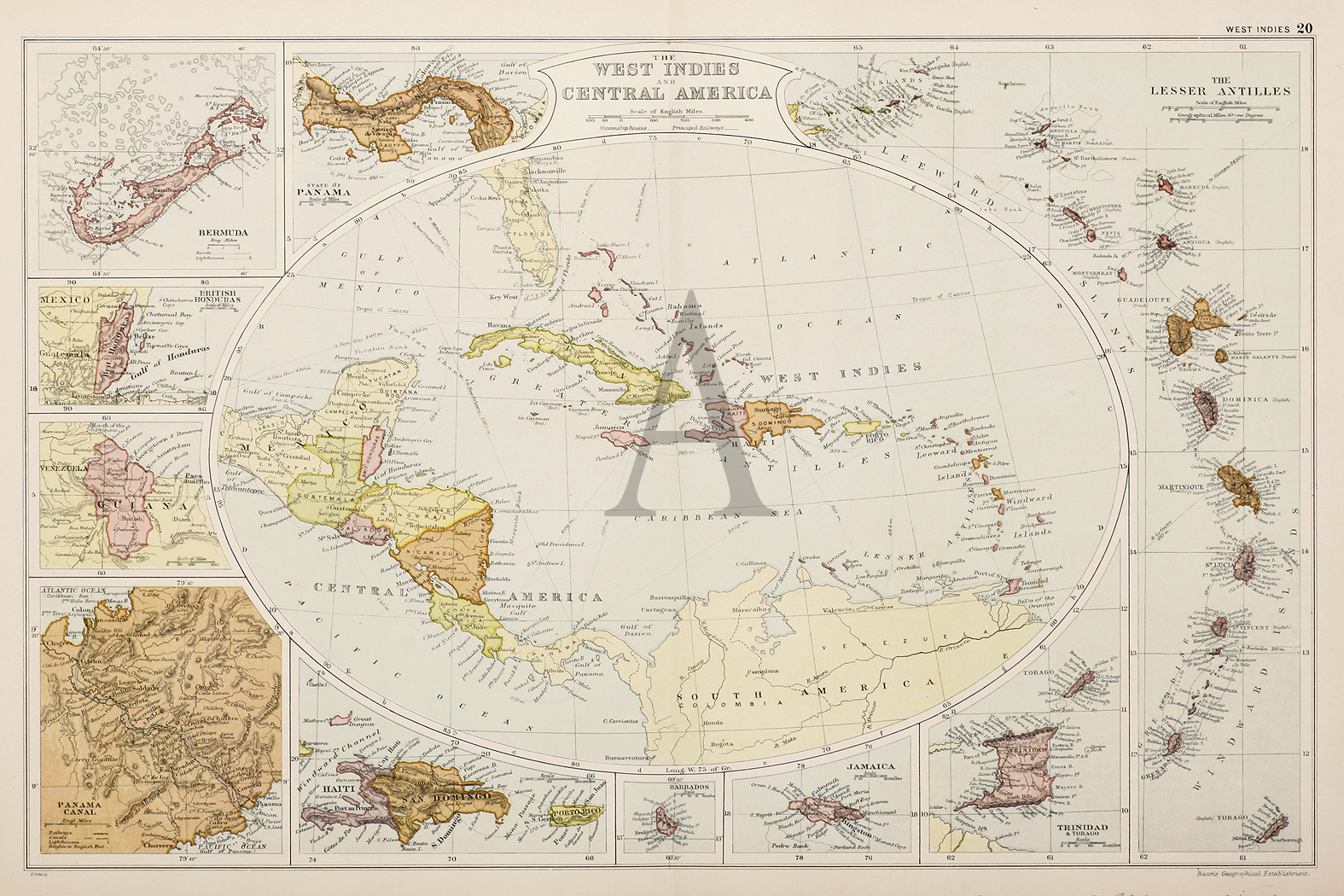 Charming oval shaped map of the West Indies surrounded by insets.