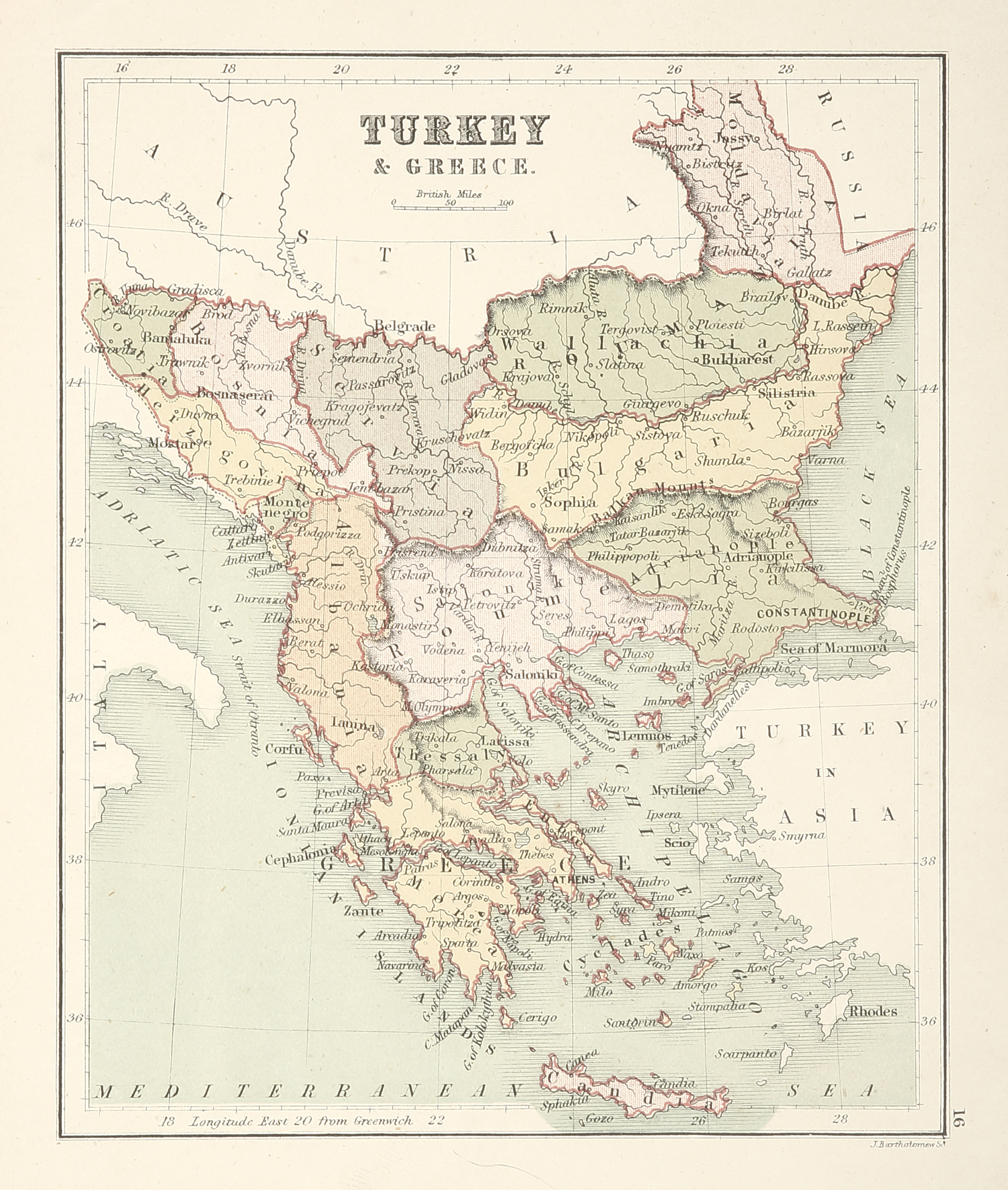 Superb miniature map of Greece and the Balkans by the pioneering Scottish mapmaker, John Bartholomew.