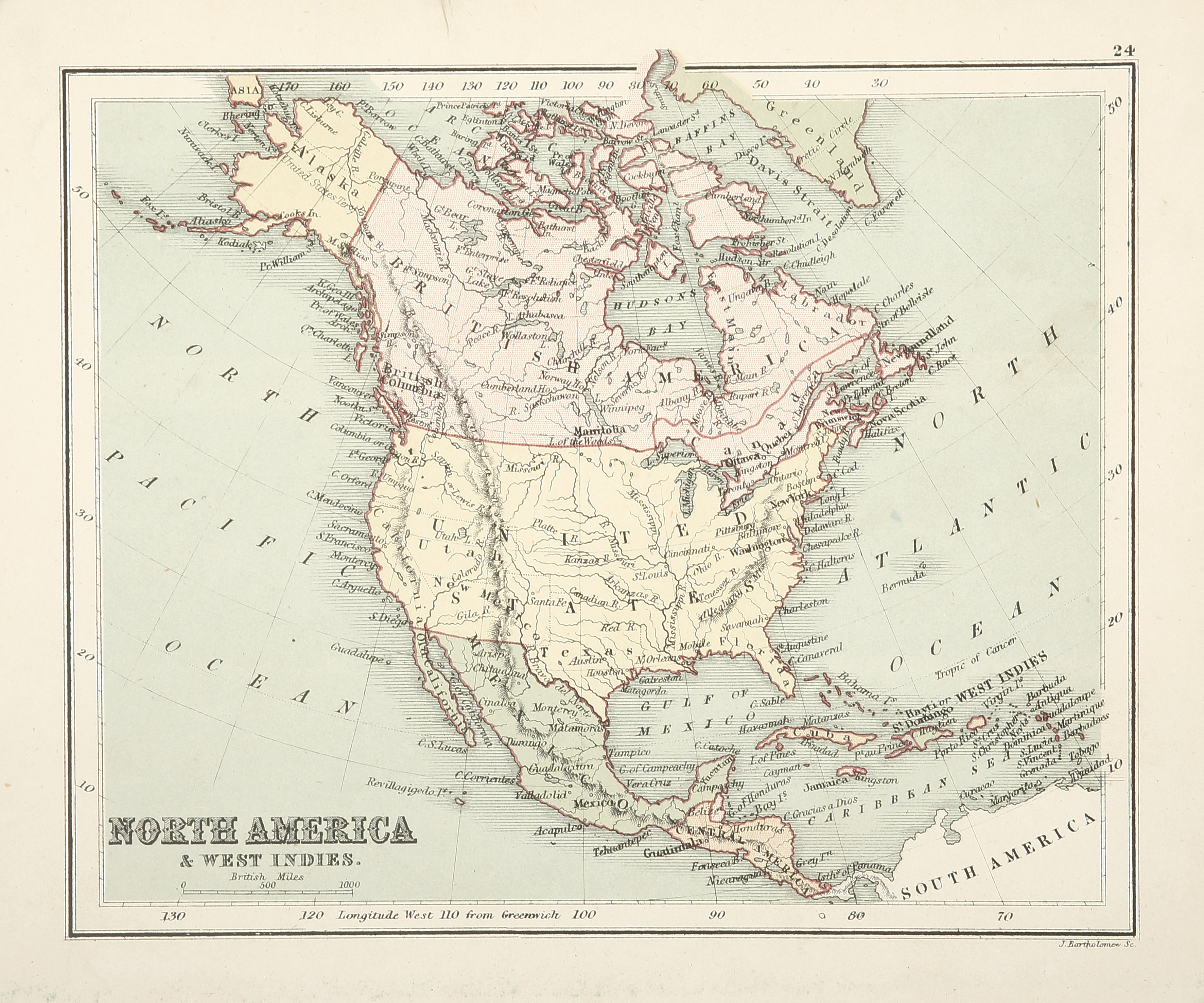 Superb miniature map of north America and the West Indies by the pioneering Scottish mapmaker, John Bartholomew.