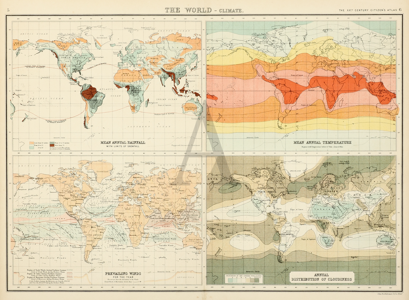 Detailed world map on Mercator’s projection divided into four showing rainfall, winds, clouds and temperature.
