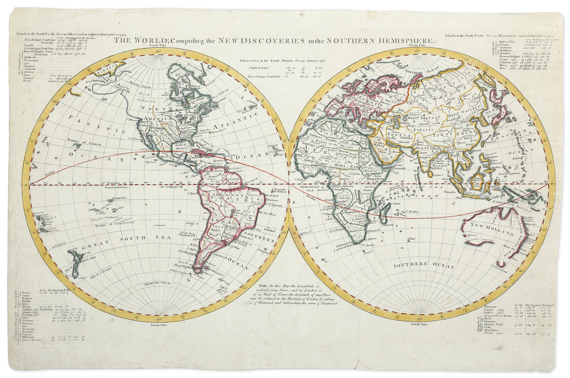 Scarce c.18th world map showing the discoveries made on Cook’s first voyage and some of the discoveries made on his second voyage; these include; the island of New Caledonia and Norfolk Island. Our map doesn’t have a publication line at bottom as other editions noted below.