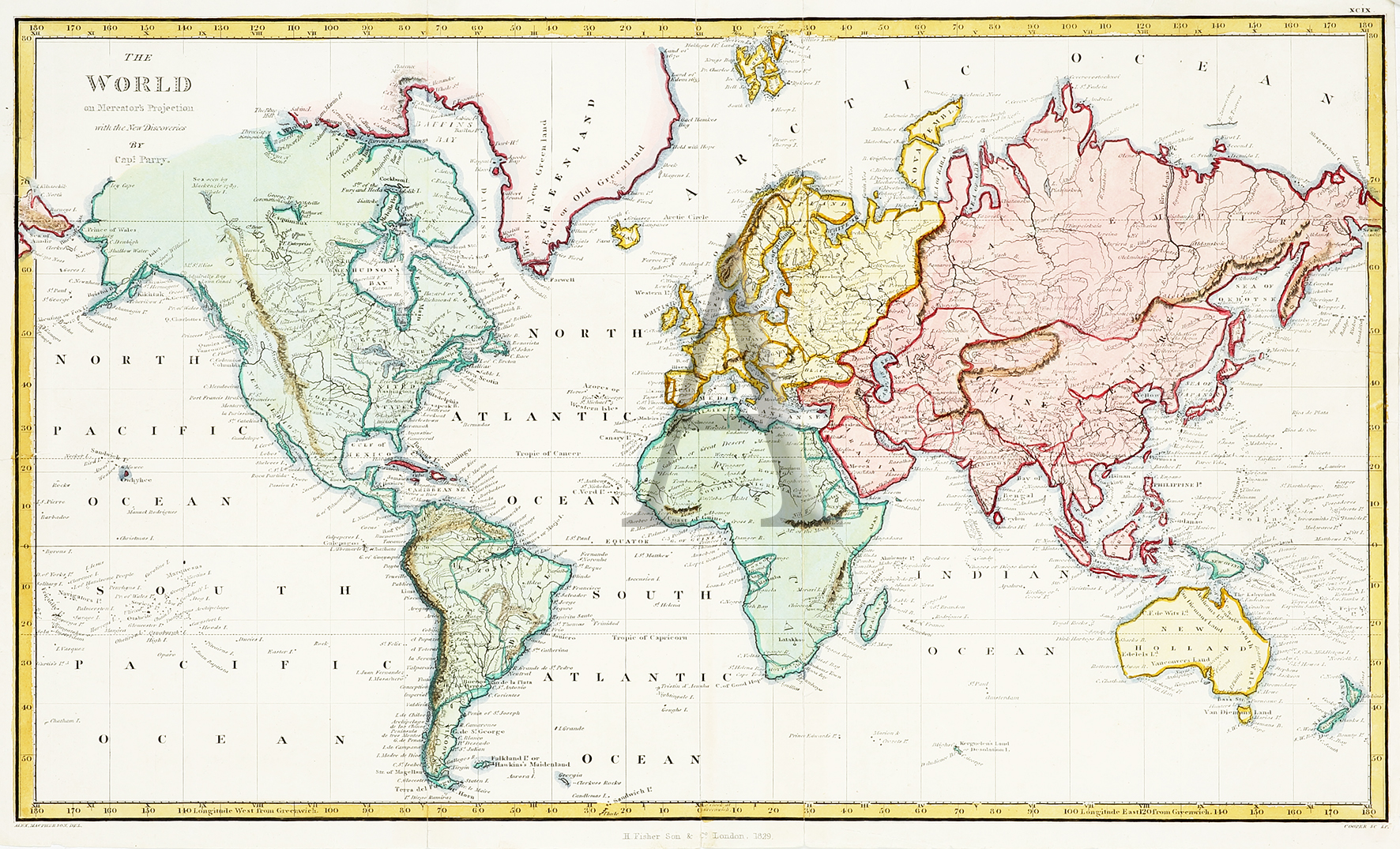 World map on Mercator’s Projection showing the discoveries made by Captain William Parry in 1819 and 1827. Australia’s southern coast is named Vancouvers Land
