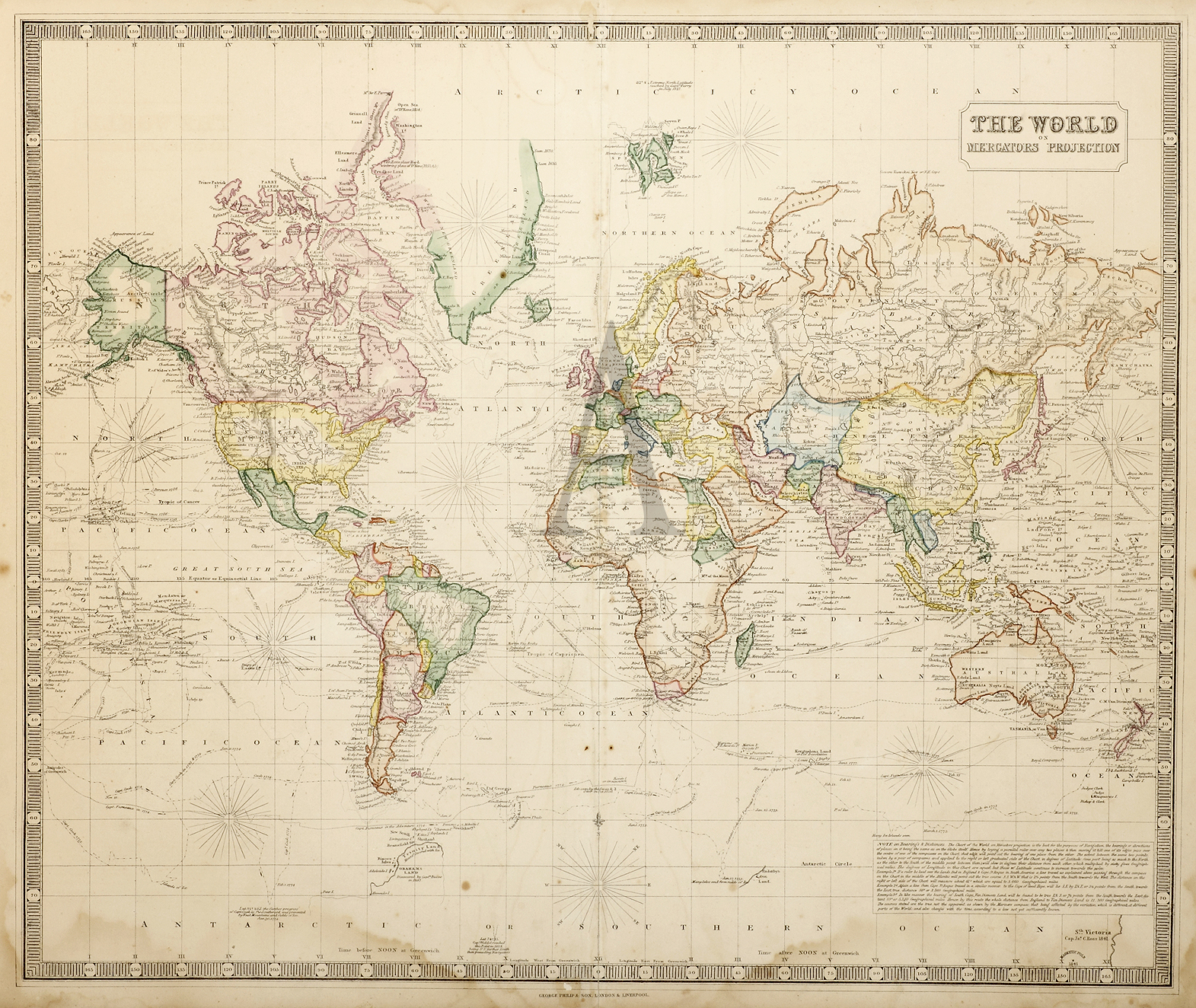 Large scale world map on Mercators projection. The tracks of numerous explorers noted. Recent discoveries in Antarctica are also shown. Inset note on bearings and distances lower right corner.